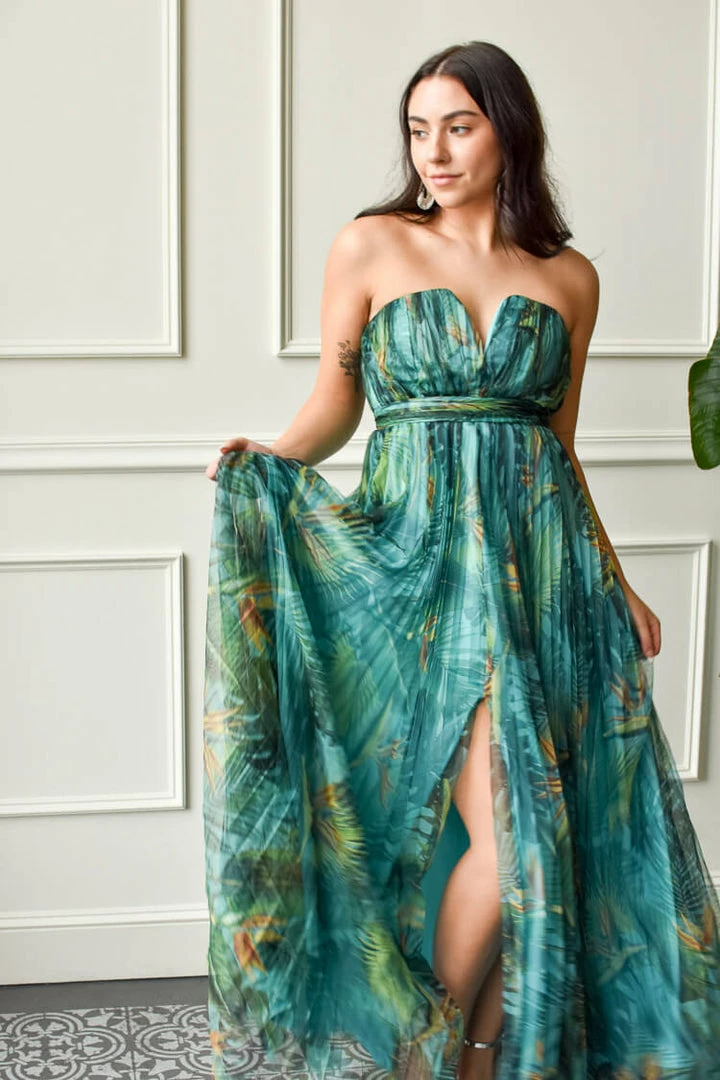 Channeling vibes of where we want to be in our Nayarit Tropical Print Strapless Maxi. This floor-sweeping gown is crafted from a flowy, palm print pleated mesh overlay. Fully lined with a thigh high front-slit. We love this look for a wedding guest dress at a beachy wedding. Adorn the bare neckline with a pair of glitzy, statement earrings.