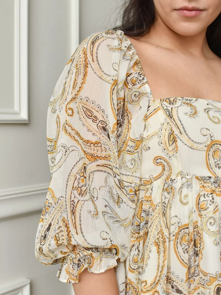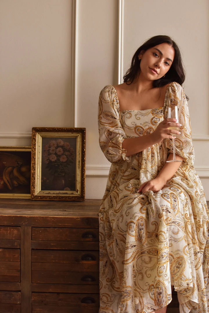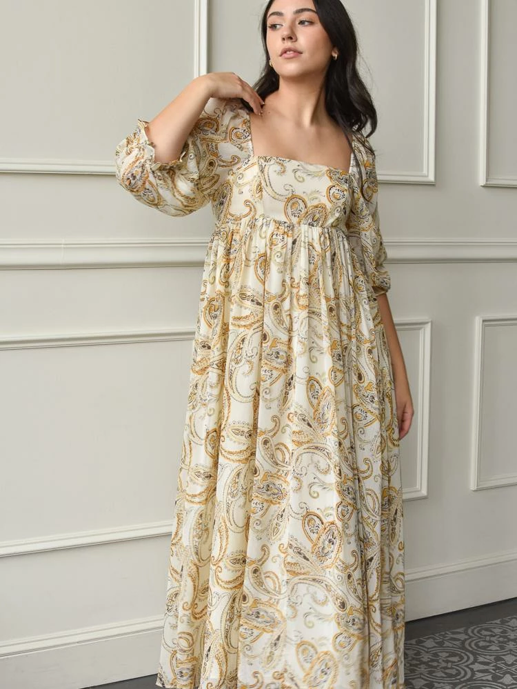 Perfect dress for when you’re playing Thanksgiving Day hostess. Our Oxfordshire Paisley Maxi Dress is fitted at the bust and flares out into a gorgeous flowing maxi dress. Features 3/4-length statement sleeves and square neckline. We love how you can style this fall maxi dress with the sleeves off the shoulders for a different look.