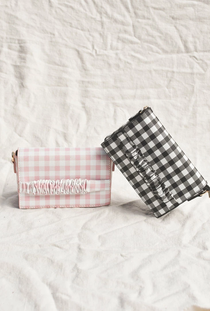 The classic clutch has been updated in a fun gingham print. Available in both black/ white and pink/white, this style features a hand strap for easy carrying and as well as an optional shoulder strap. Pair with a classic white dress and sandals for an everyday spring look.