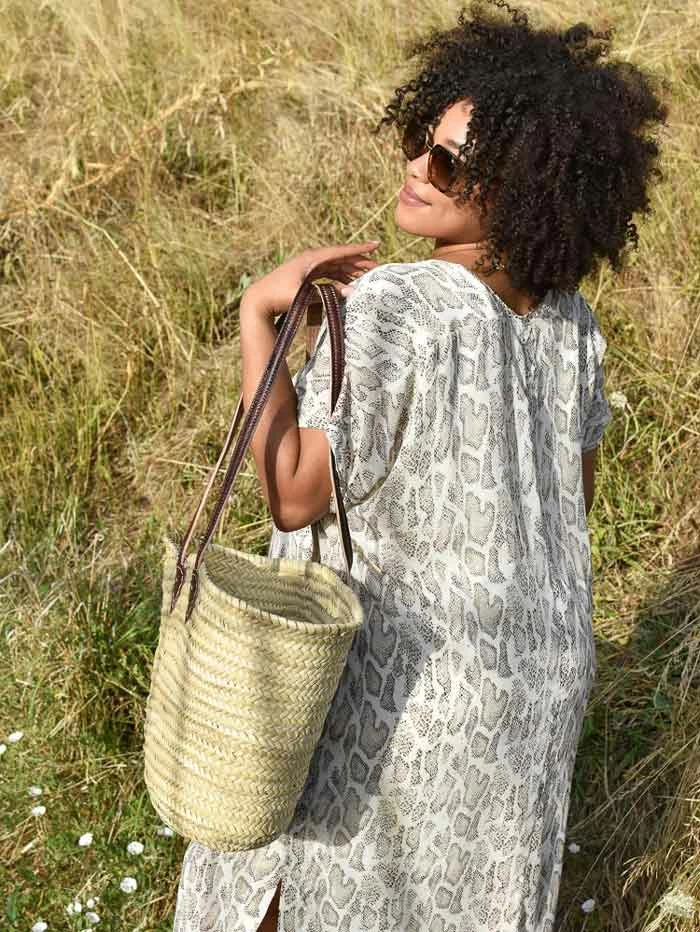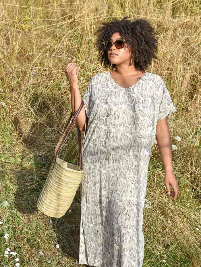 Our Python Maxi Dress is the perfect transitional piece to take you from summer to fall with its taupe snakeskin print fabric with metallic gold threading throughout. This snakeskin dress features short sleeves and a mid calf slit. We love this plus size maxi with our Pacific City tote and Upgrade sunnies.