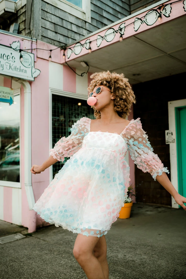 This is the ultimate party dress! This colorful mini features all over rainbow 3D florals in a classic babydoll silhouette. Puff sleeves. Hidden zipper back. Hits mid-thigh. We love this for mamas to be for their baby shower.