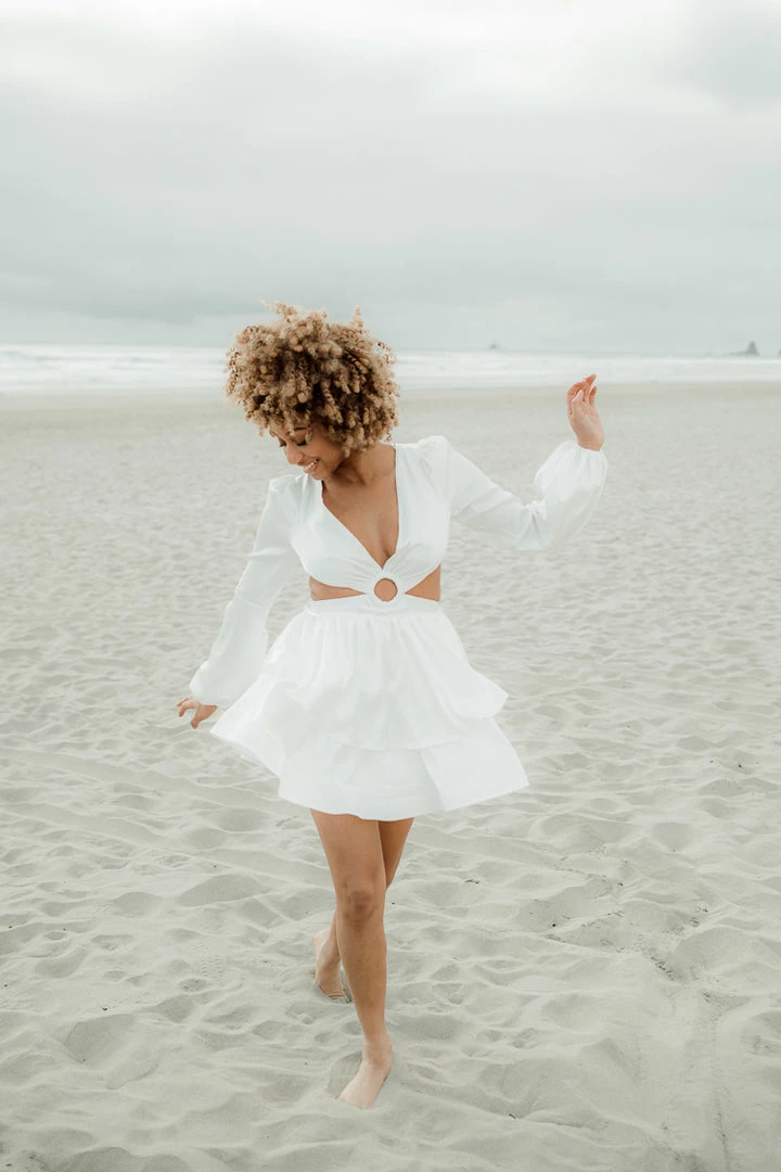 This is the ultimate honeymoon dress. Meet the Rya mini. Cut from a luxe silky fabric, this little white mini dress features long sleeves and perfectly placed cut-outs that flatter any body type. Lace-up back. Fabric covered elastic waistband.