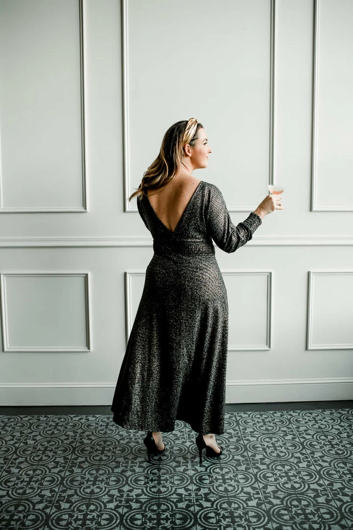 Shine bright in this beautiful, shimmering metallic knit maxi dress. The Sofia is cut from super soft black knit with gold threading throughout. Deep V Back. Ruched waistband. This dress is super cozy and stretchy, perfect for holidays at home. We love this dress with our gold knotted headband.