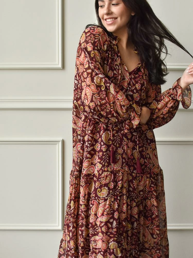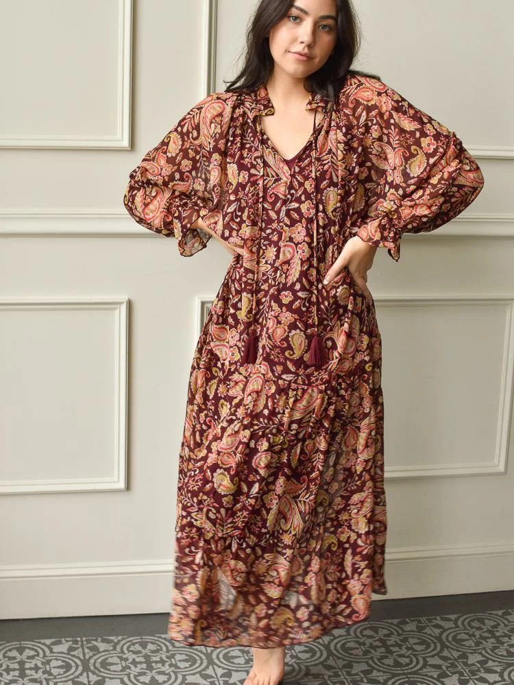 The Keely Burgundy Paisley Floral Maxi dress brings equal parts elegance and nostalgia. Cut from a richly colored floral print, the design has a ruched neck, v neckline, tassels, long puff sleeves and flowy body. This makes a stunning Thanksgiving dinner outfit. Fully lined.