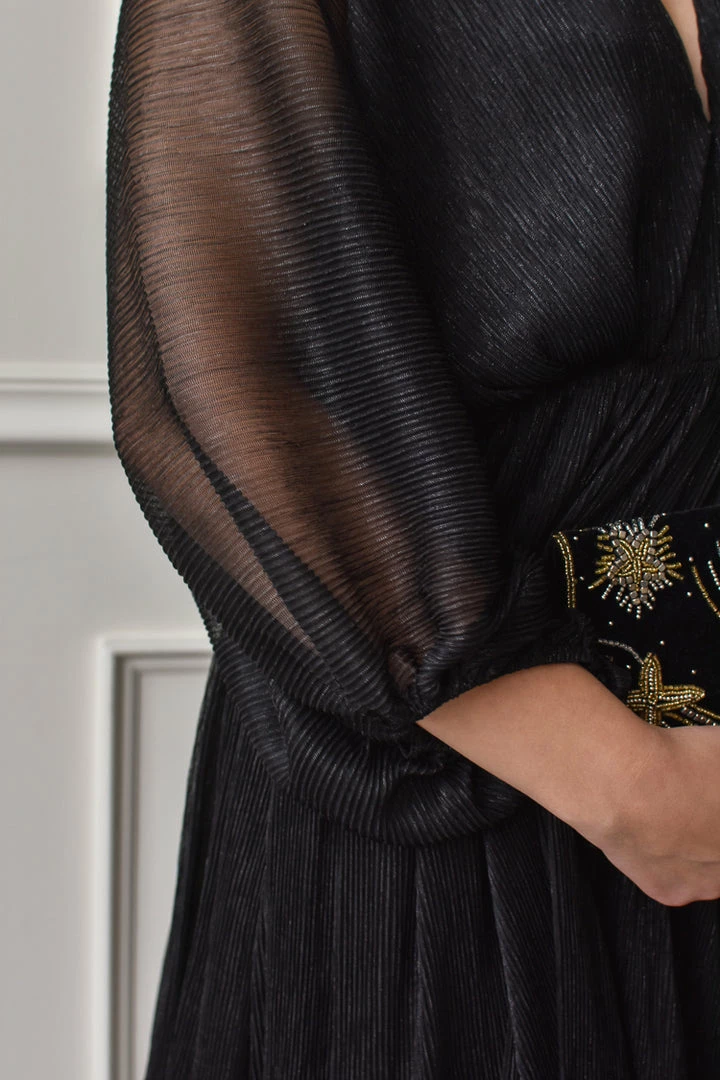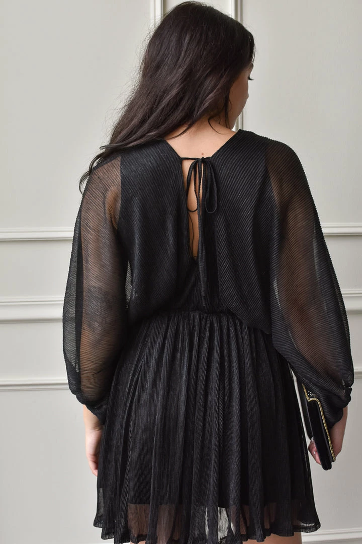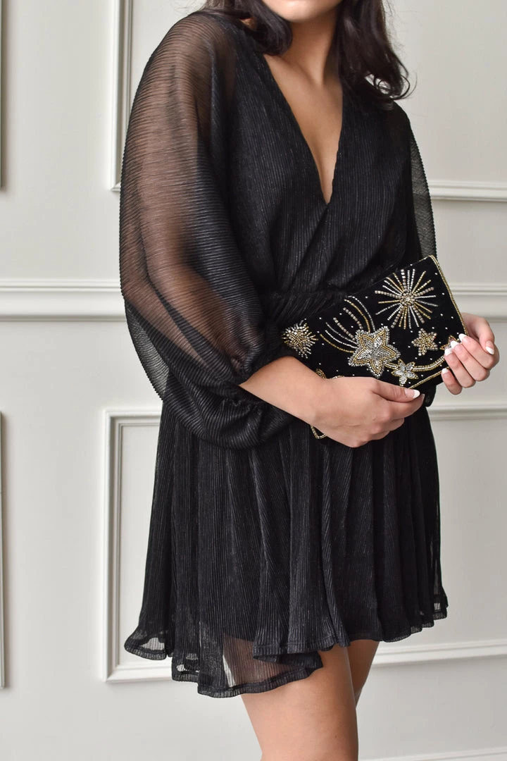 Take this party into the wee hours of the morning in our Paris Metallic V Neck Mini Dress. This style features pleated shimmery fabric with metallic threading throughout, cut in a v neck style with long, see-through dolman sleeves. Pair with strappy sandals and our Velvet Star Clutch for a night out.
