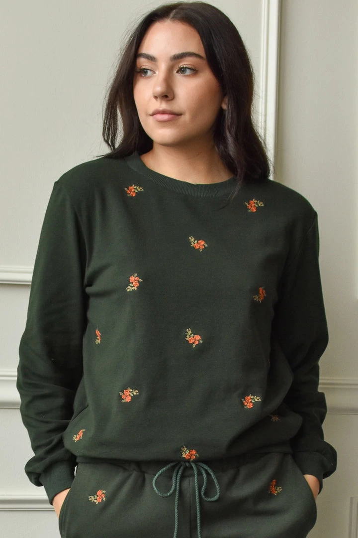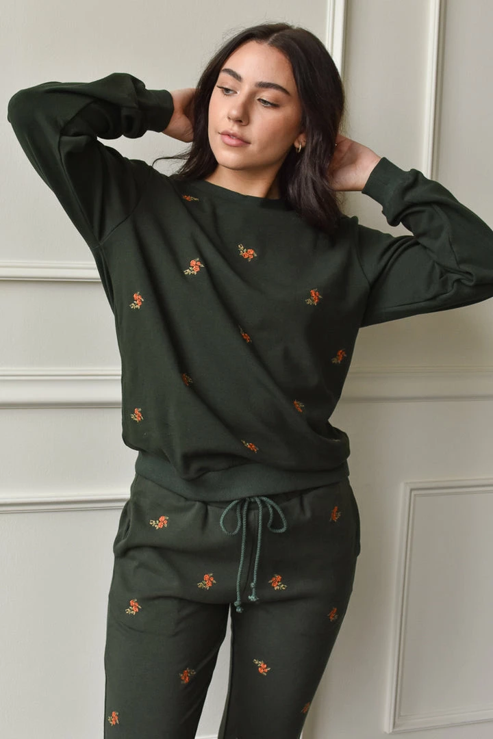 Here’s to hoping you are cozy out there! Our Rosie Floral Embroidered Sweatshirt is the perfect pick for a comfy Thanksgiving Day look. This top features rust-colored embroidered roses on plush hunter green fabric. Pair with the matching sweatpants for the ultimate snuggly set. Note: embroidery is only on the front of the sweatshirt.