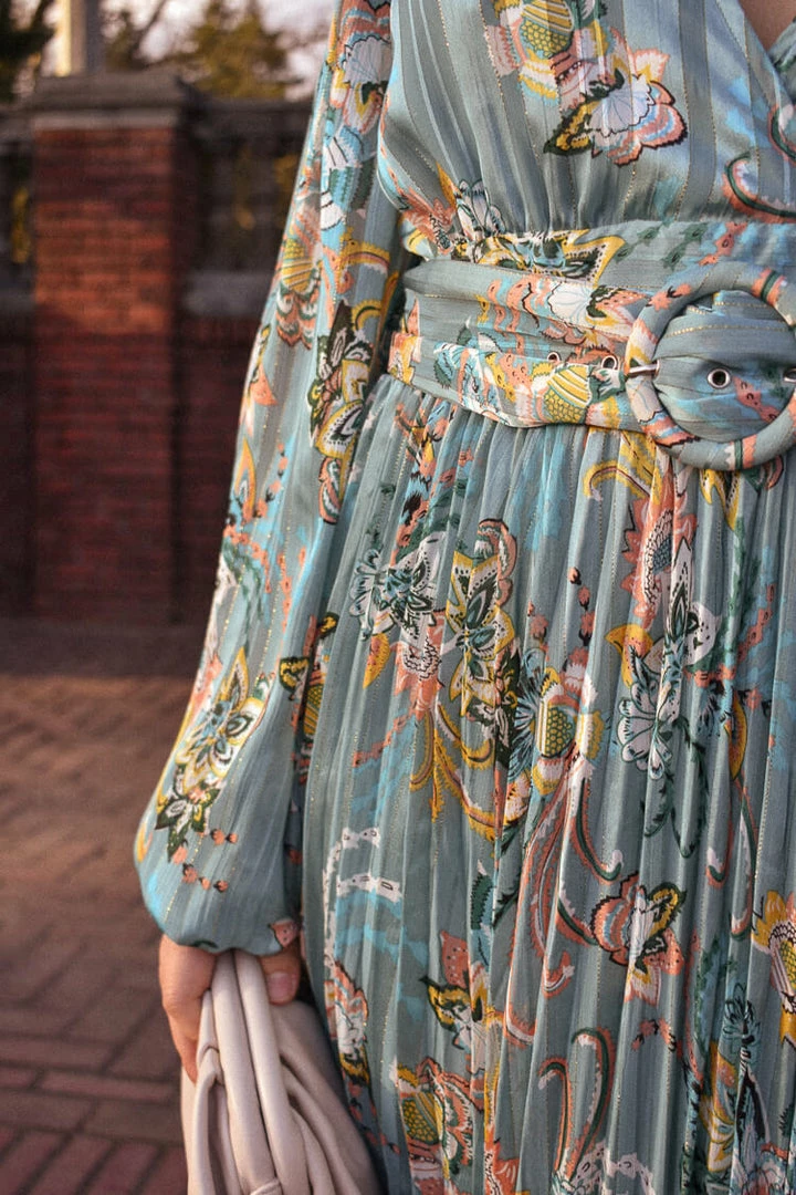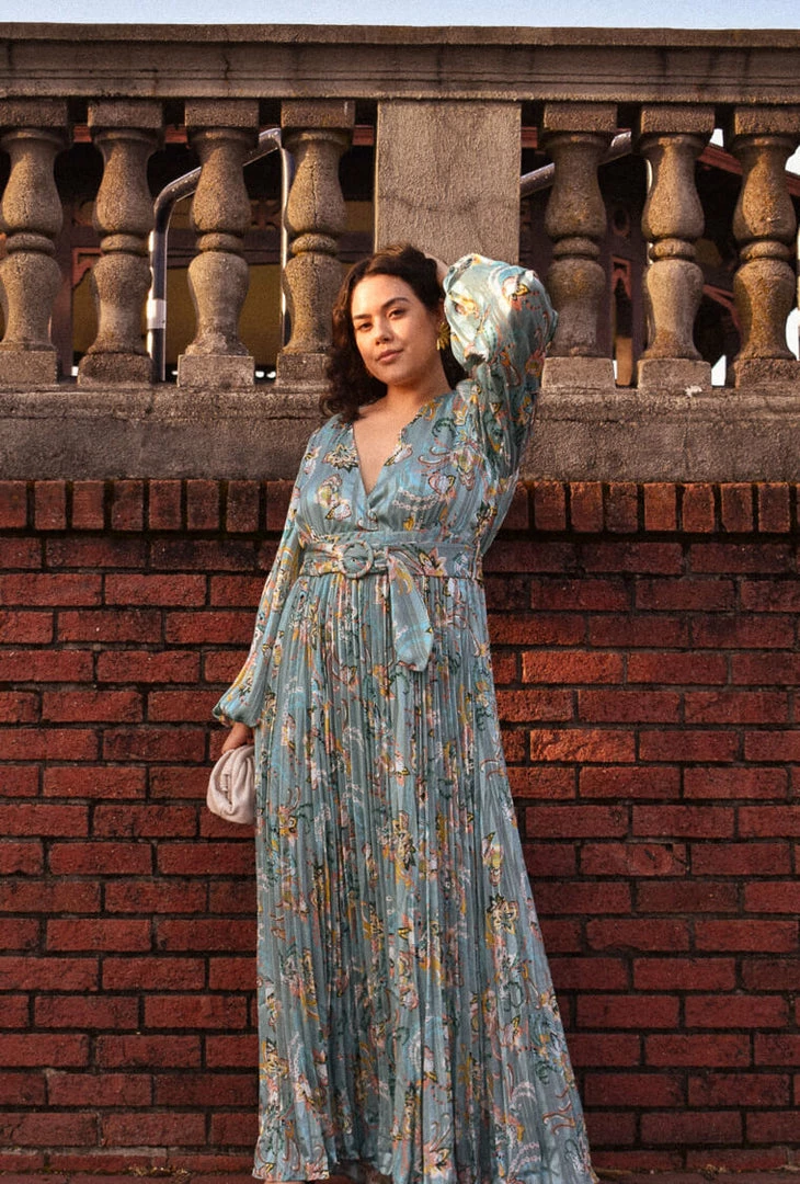 Lovely and luxe, our Somerset Belted Maxi Dress is the flattering head turner that we all need in our closets. Cut from silky, flowy paisley floral fabric, this plus size spring stunner features a waist-cinching belt, soft pleats and deep V neckline. Gold metallic threading throughout. Make it a complete outfit by adding our Abientot earrings and Mia clutch.
