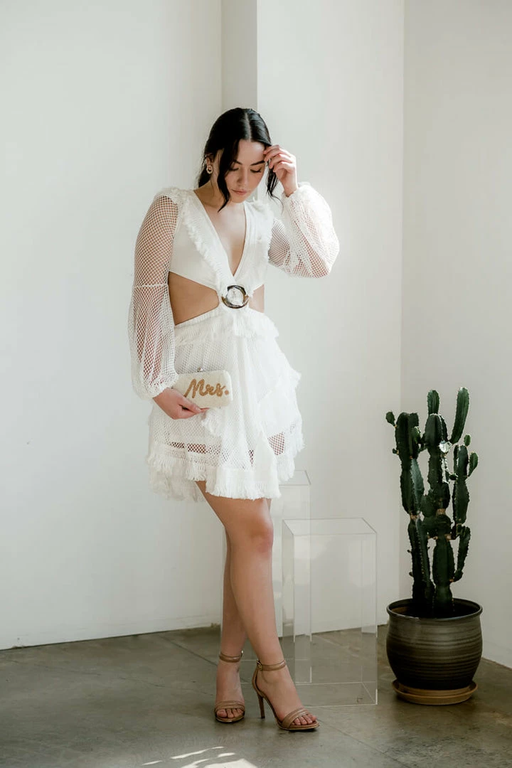 This is the ultimate beach weekend bachelorette dress. Meet the St. Tropez mini – featuring that decorative, all-over crochet, long sleeves and perfectly placed cut-outs that flatter any body type. Lace-up back. Fabric covered elastic waistband.