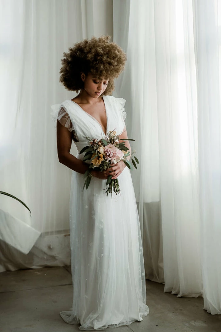The Starry Eyed Glitter Star Mesh Maxi Dress is a Confête favorite. Starry Eyed features an a-lined silhouette, deep v-neck, glitter stars and a slight ruffle cap sleeve. This version features white glitter stars on a white mesh fabric. Fully lined. Hidden back zipper enclosure. 100% poly. Hand wash cold. Comes in black, gold, dusty blue, blush and white.