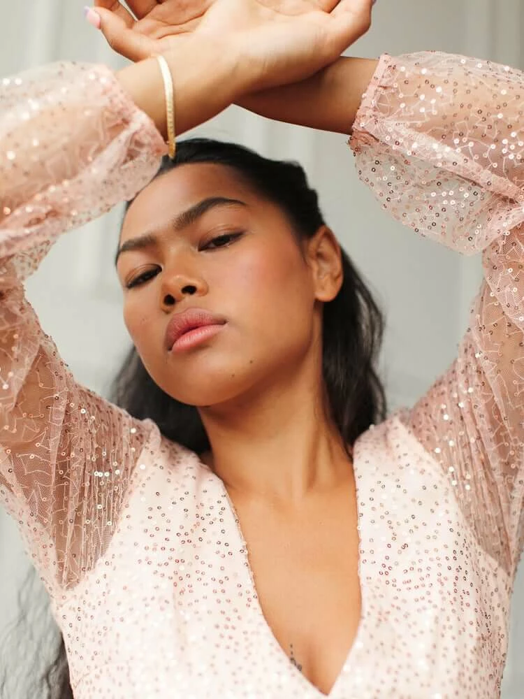Try the Sunrise Sequin Party Dress if you’re looking to make a high-shine statement. A stunning floor-sweeping, pale pink sequin maxi dress that is made for engagement photos, attending a black-tie wedding or wowing at your birthday dinner. This style is a Confête exclusive. Featuring a v-neckline, plunge back and soft blouson sleeves. Hidden zipper in the back. Half lined.