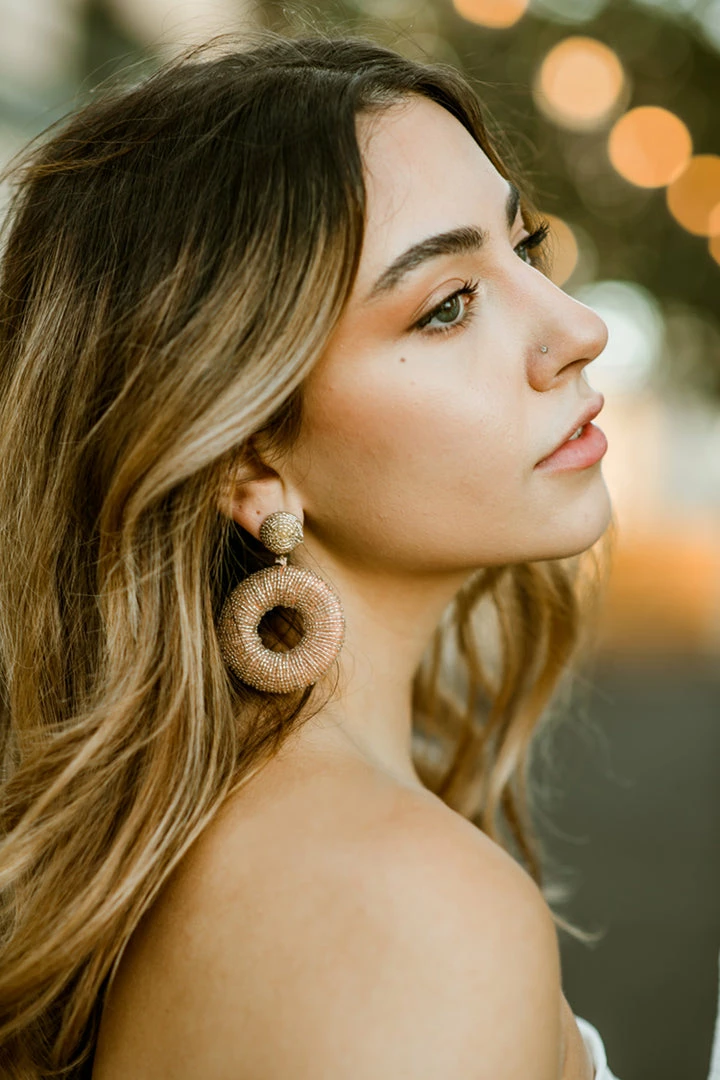 The Susana Beaded Circle Drop Earrings turn any outfit into a showstopper. Blush seed beads cover these oversized circle earrings, which add instant chic to casual and dressy outfits alike. Available at Confête in silver and blush.