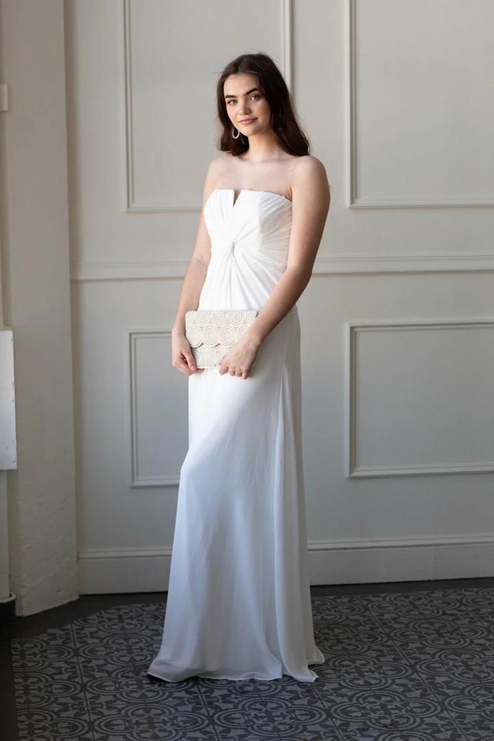 Love is in the air with our floaty Julianna Strapless Maxi. Column-style dress with slight flare featuring a straight notched neckline. Chiffon overlay. Ruched bodice. Fully lined. Hidden back zipper enclosure.