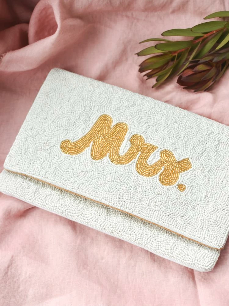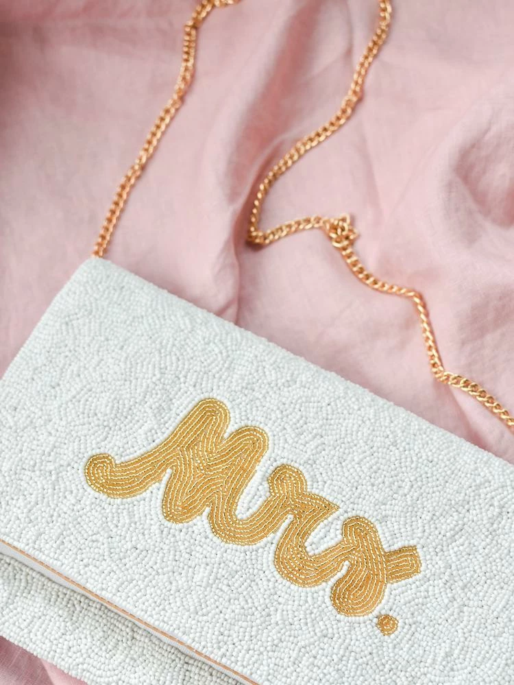 The Mrs. Bag is one of our best selling wedding accessories and a must have for any bride. White and gold acrylic beads. Removable chain strap. Magnetic snap closure.