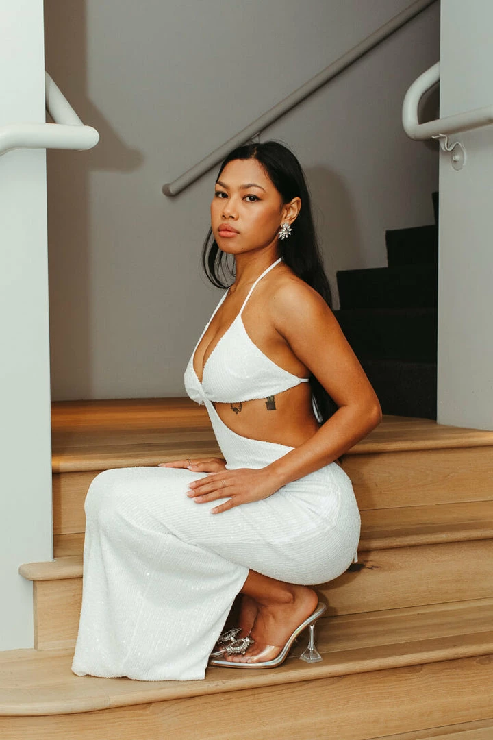 The ultimate bachelorette party dress had to be named after an epic bachelorette party destination! Cut from stretchy white sequin fabric, our Tulum Nights midi features sexy side cutouts designed to hug all your curves. Ankle-length on model 5’6.