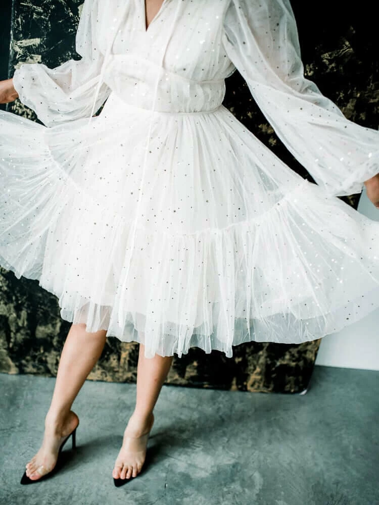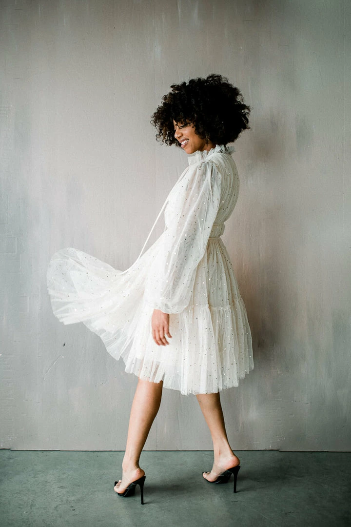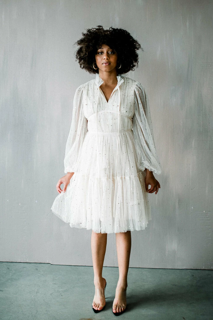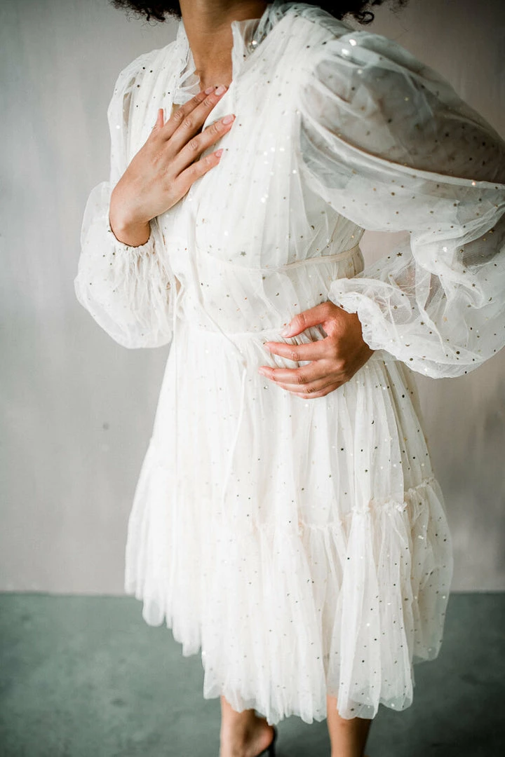 The Twilight dress is cut from soft creamy tulle, adorned with metallic gold and silver dots and stars. A fitted bodice cinches the waist for a flattering silhouette and its high neck gives this style a modern feel. Perfect for holiday photos or bridal events, where the bride-to-be is looking for a truly unique piece.