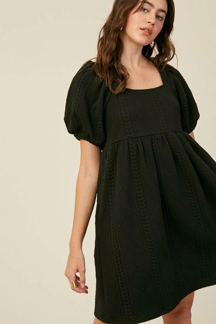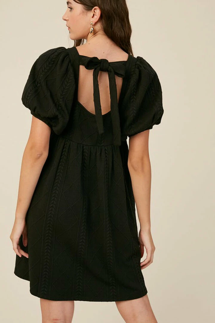 Our Viola Puff Sleeve Black Mini dress is a spring wardrobe staple. Pretty as a picture with puff sleeves, textured mid-weight knit and bow tie back. The only thing that makes this dress better is: it has pockets! We love its easy pull-on style and babydoll-inspired silhouette. Available in Black and Ivory.