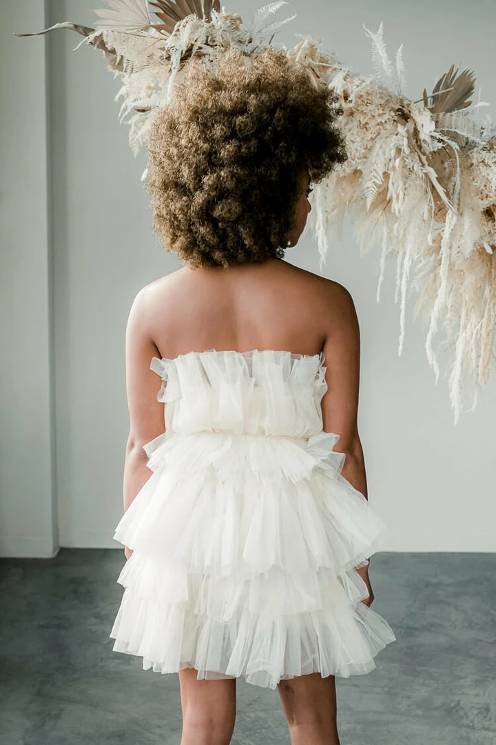 Equal parts off-beat and feminine, the Waldorf Tulle Mini is the ultimate party piece. Available in both cream and blue, this style features a slimmer silhouette adorned with tiers of delicate tulle. Hits mid-thigh. Inner lingerie band helps this strapless style stay in place. Elasticized waist.