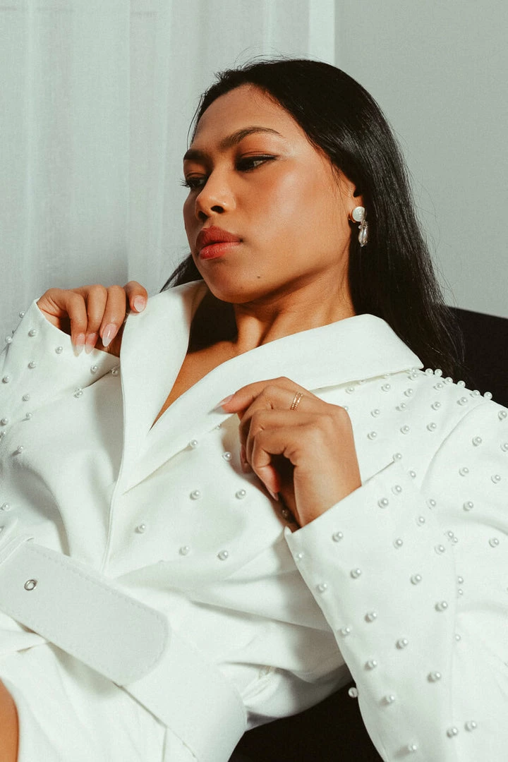 Delicate pearls all-over give this blazer mini dress elegance and personality. Available in regular and plus sizes. Perfect for the traditionally-minded bride, the Yvonne is a classic, white blazer-style mini dress. Deep-v neckline. Comes with a matching, optional belt. A slightly padded shoulder gives this style structured and cinches your waistline.