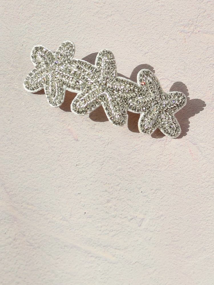 A pretty, beachy barrette, embellished with glass crystals in a starfish motif. Pair with a floaty white maxi dress for a perfect honeymoon evening look.