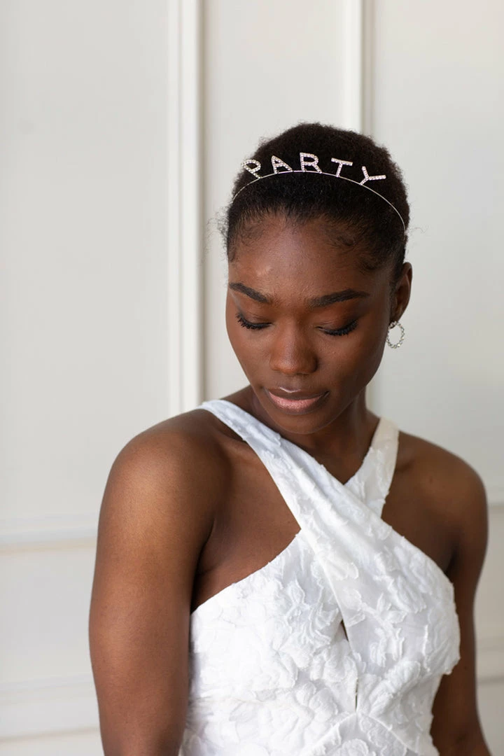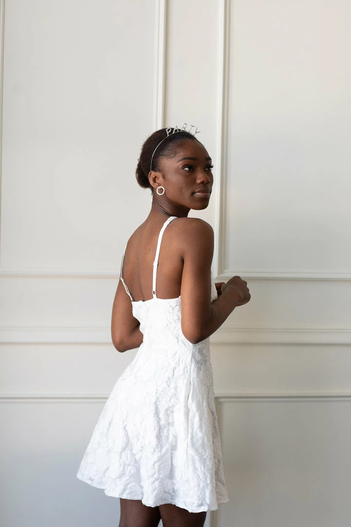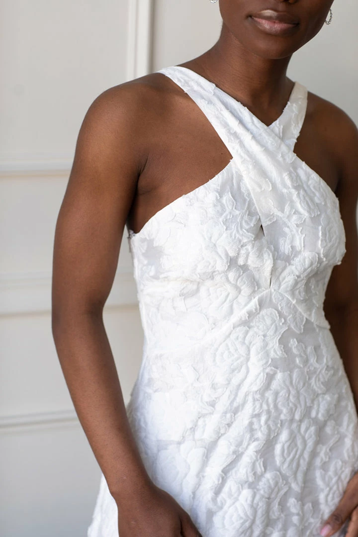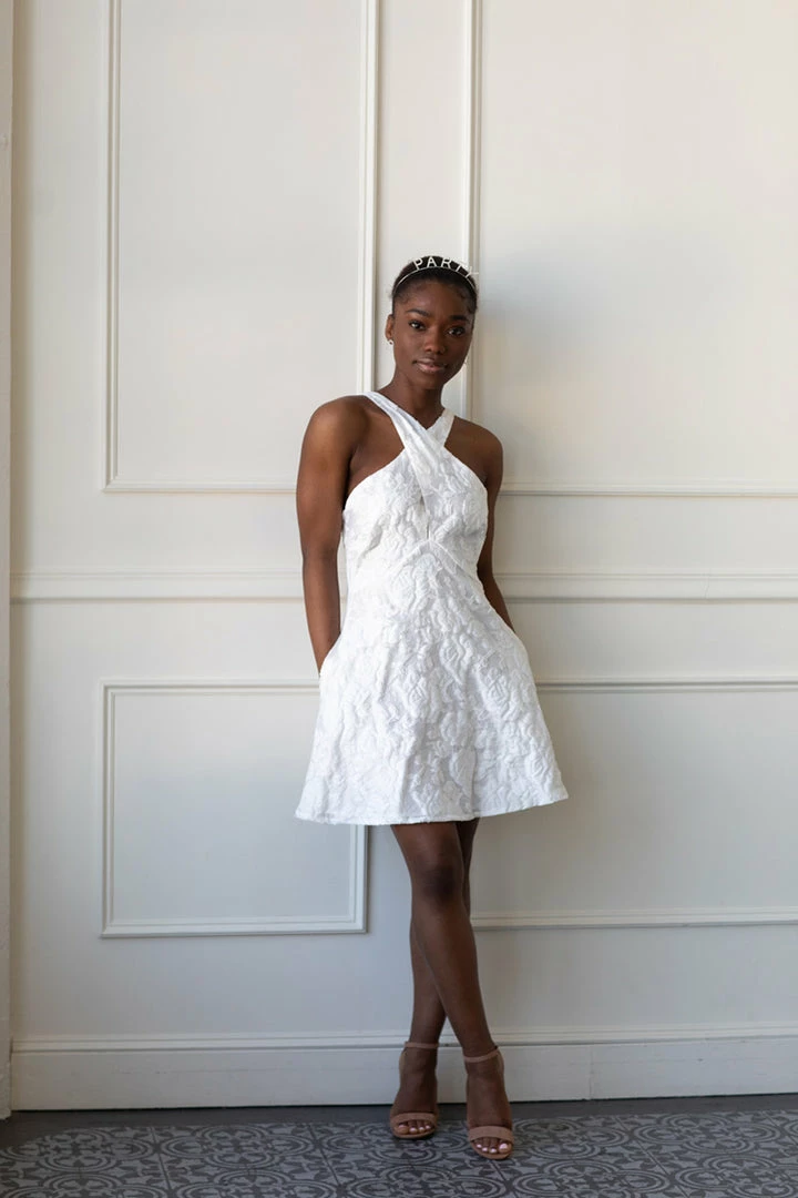 Be the star of your own romantic moment in the Michaela Brocade mini. Crossover front with adjustable back straps. Soft white brocade fabric.