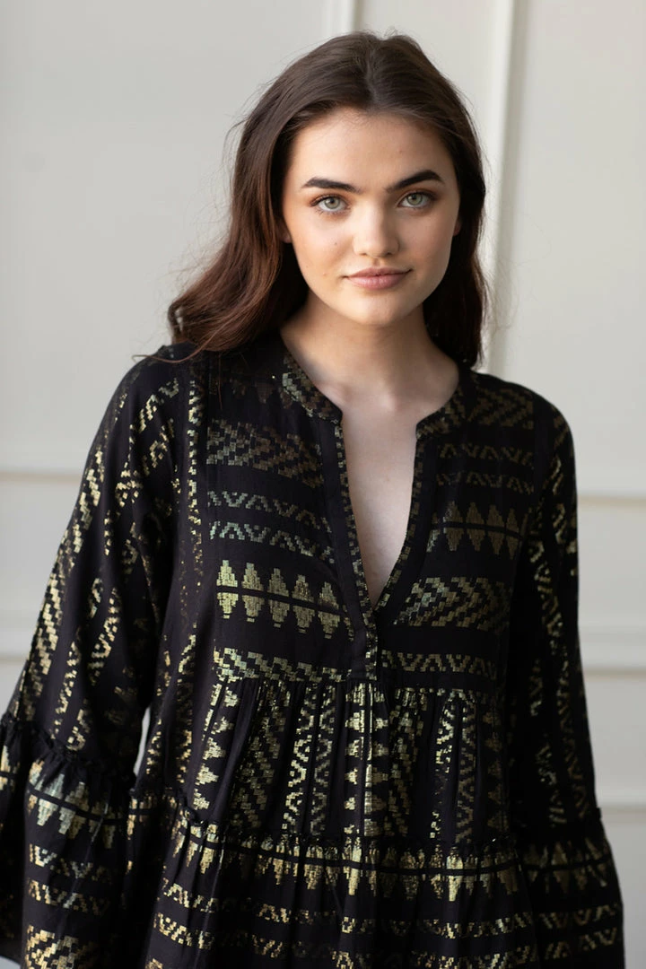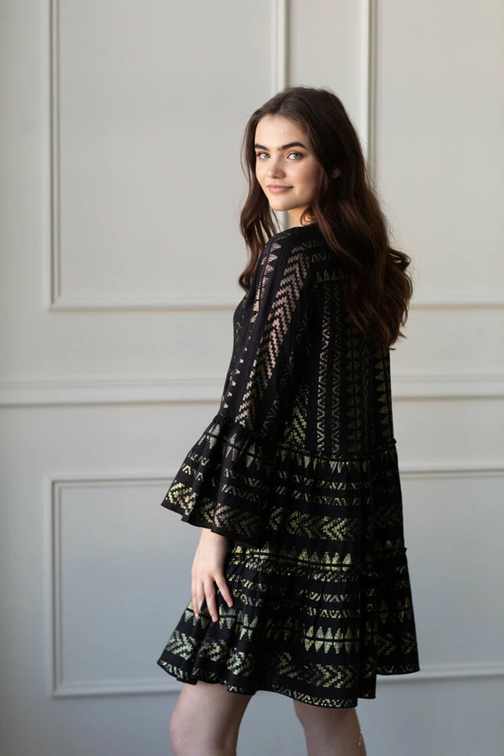 The Ana Black and Gold Thread Dress is an effortless, fun piece for any summer occasion. It can be worn just as easily around the house as dressed up for dinner. Features an easy fit that’s flattering on any silhouette.