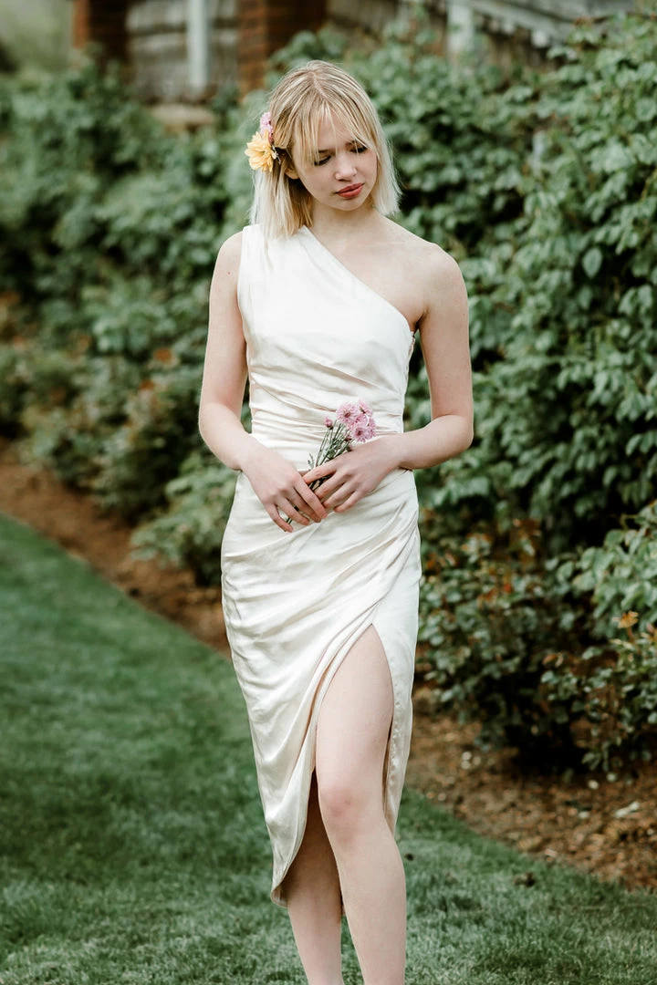 This much-loved style from Elliatt is perfect for your rehearsal dinner! The Cassini Dress in Pearl is cut from luxurious hammered satin and features a one shoulder silhouette. Its side ruched detail flatters any body type. Hidden side zipper. Fully lined. Hand wash cold. Available in pearl and navy.