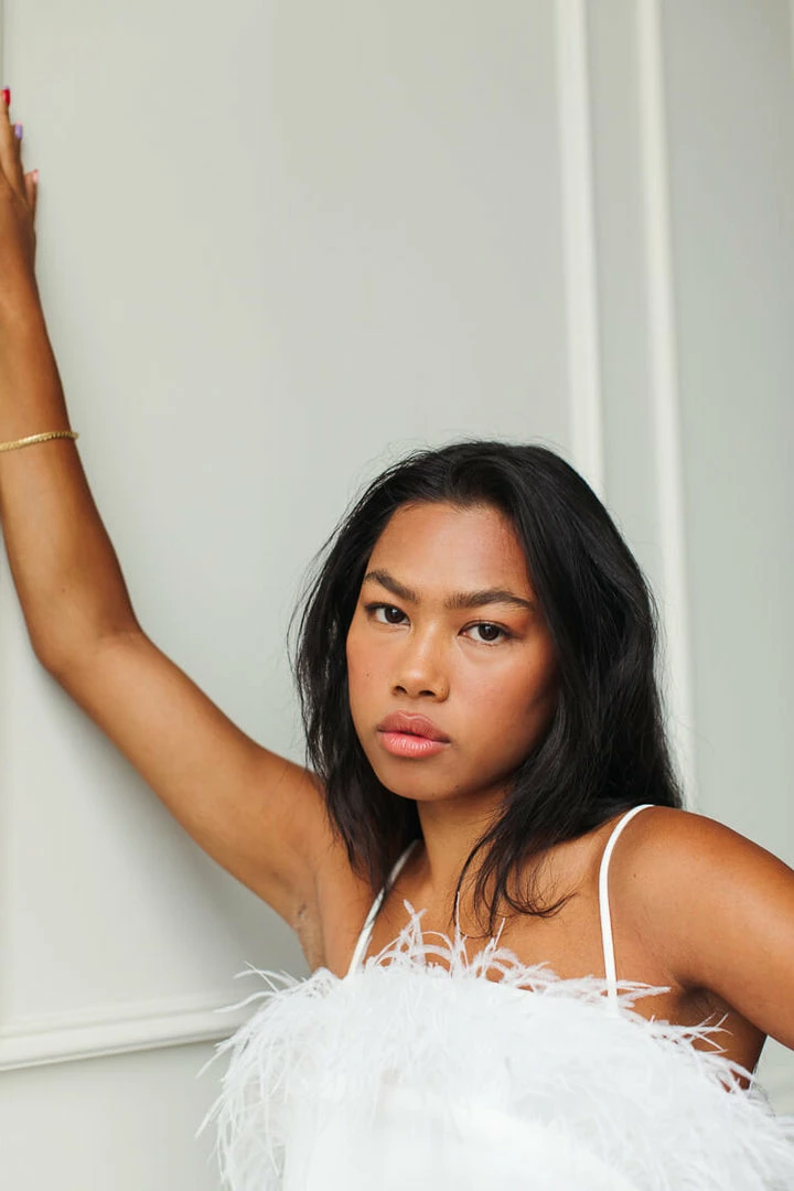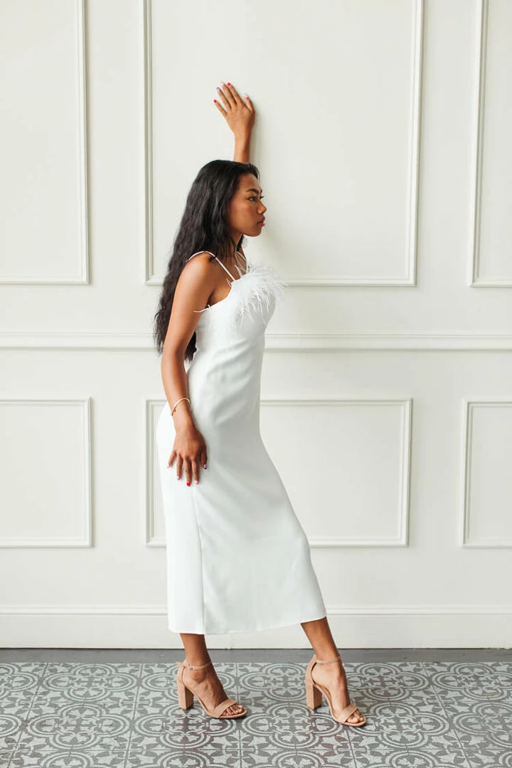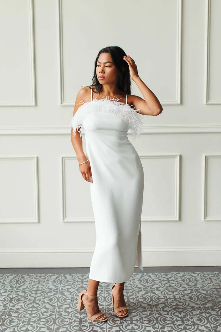 A feathery trim finish along the neckline makes this a bridal favorite for rehearsal dinners and wedding after-parties. The Harley Dress, from Australian evening gown brand Elliatt, is a sleek ivory crepe midi dress with adjustable spaghetti straps and hidden zip back.