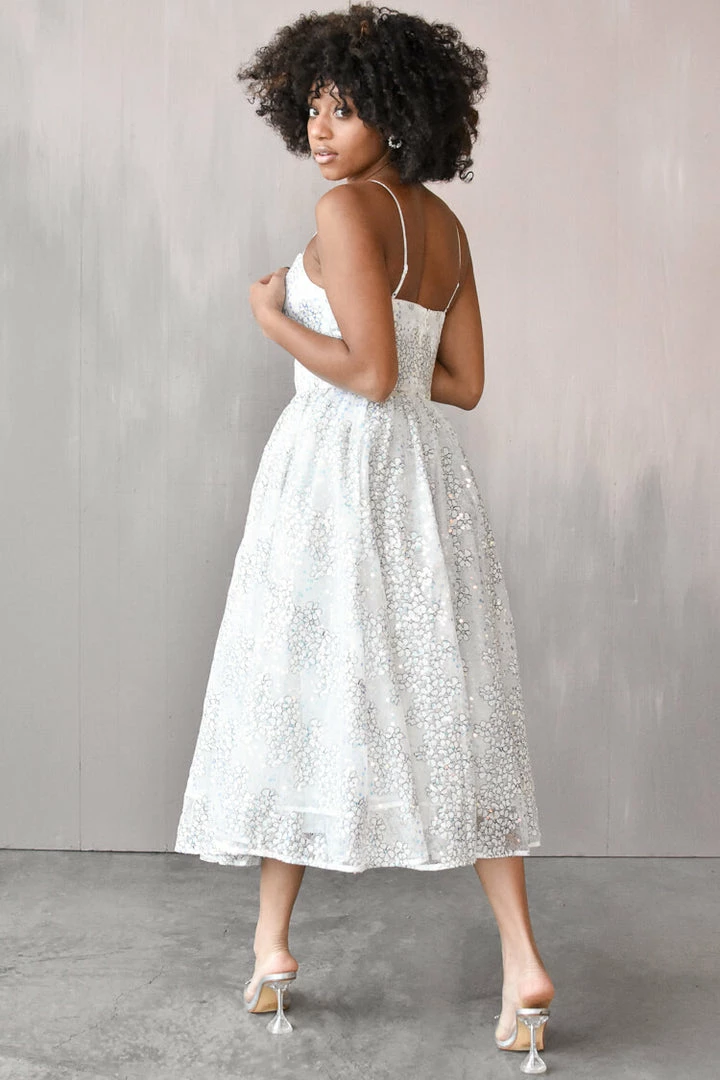 A bridal shower dress that is equal parts feminine and modern, the Harrow Dress from Elliatt is cut from an iridescent sequin lace fabric and adorned with black embroidered flowers. This is a classic a-line style midi dress. Adjustable spaghetti straps. Hidden zipper back.
