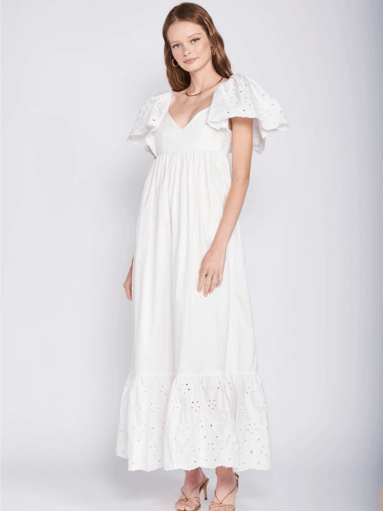 Flutter sleeves and eyelet details make this 100% cotton dress a spring and summer must-have. The Brandi dress from En Saison is a maxi length dress, finished with a voluminous bottom eyelet ruffle. We love this style for your honeymoon or post-wedding brunch.