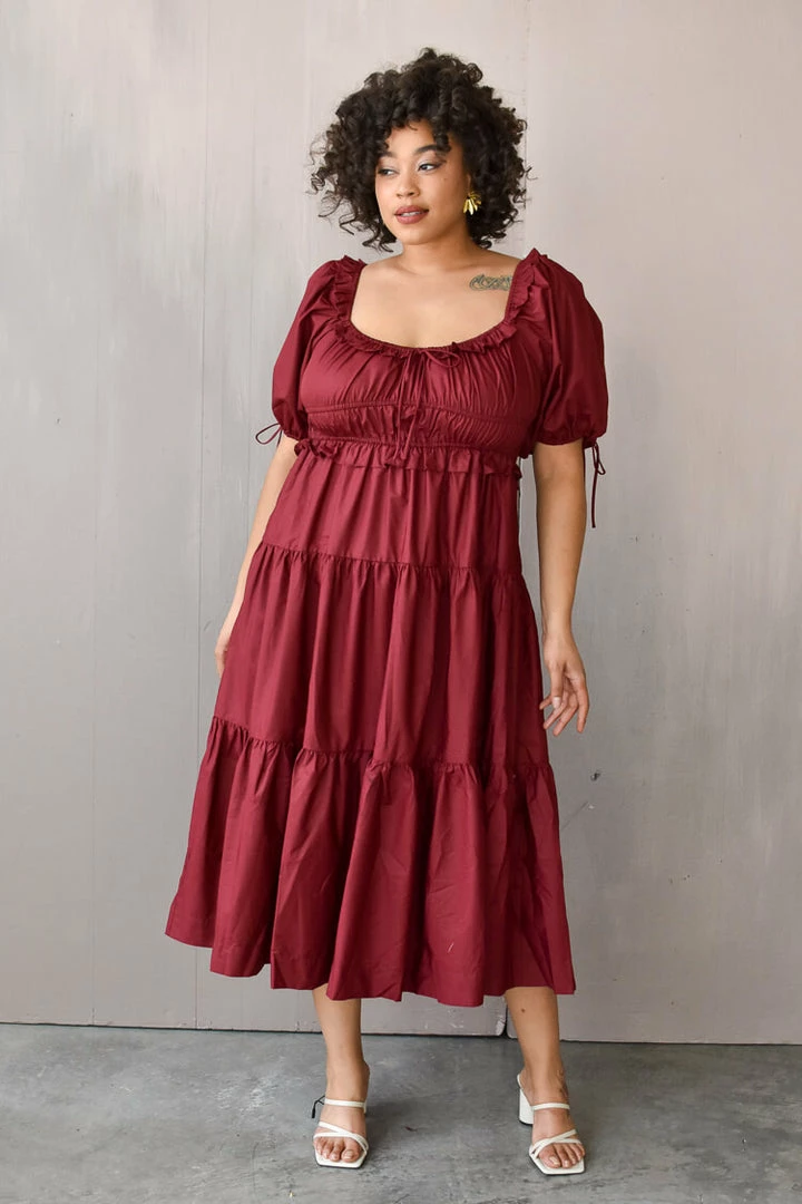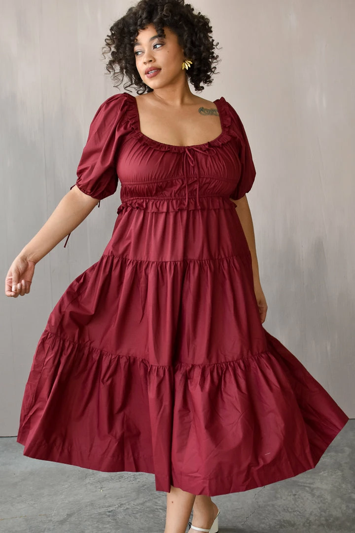 Feminine and romantic details make this easy-wearing burgundy midi dress a holiday favorite. From En Saison, the Brielle Burgundy Cotton Poplin Midi Dress features delicate ties on its puff sleeves, a scooped neckline and a ruffled, tiered skirt.