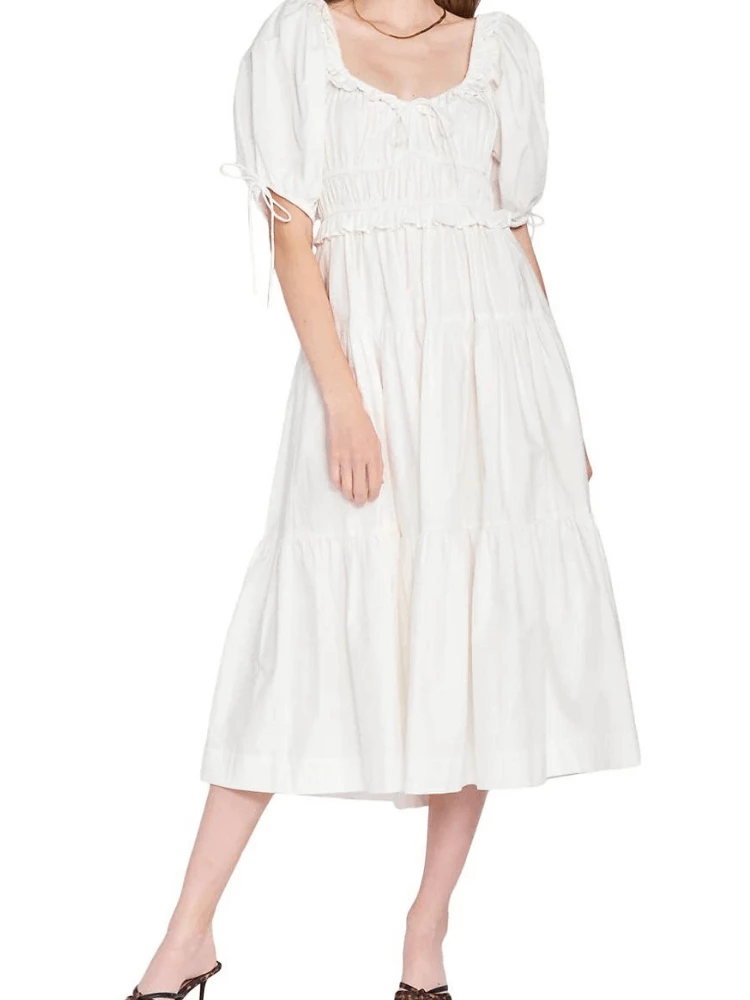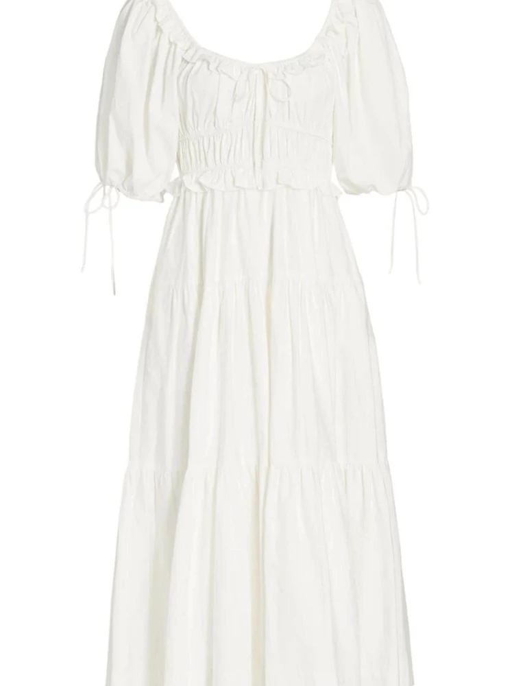Feminine and romantic details make this easy-wearing midi dress an everyday favorite. From En Saison, the Brielle Cotton Poplin Midi Dress features delicate ties on its puff sleeves, a scooped neckline and a ruffled, tiered skirt. Available in white, pink and burgundy.