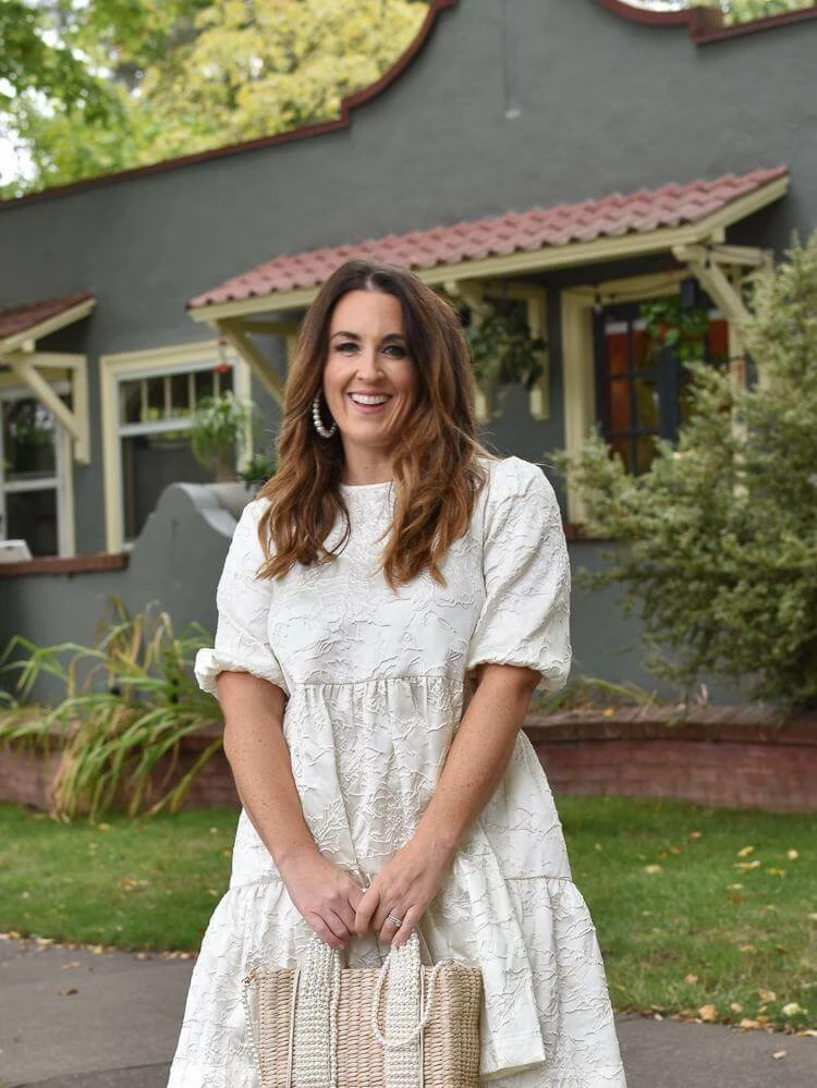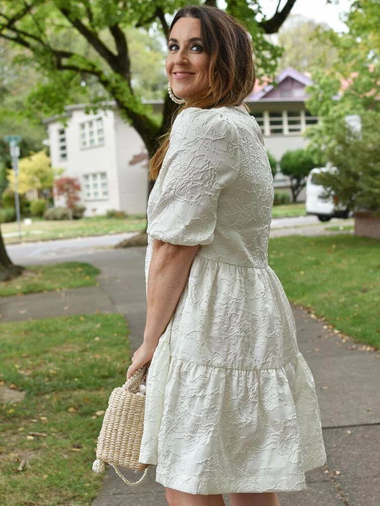 Ivory jacquard fabric adorns our Charlotte Tiered Mini Dress, cut in a darling babydoll silhouette. This is an easy to wear style. We think this makes the perfect bridal shower dress or date night outfit when paired with our Grace Faux-Pearl Woven Tote.