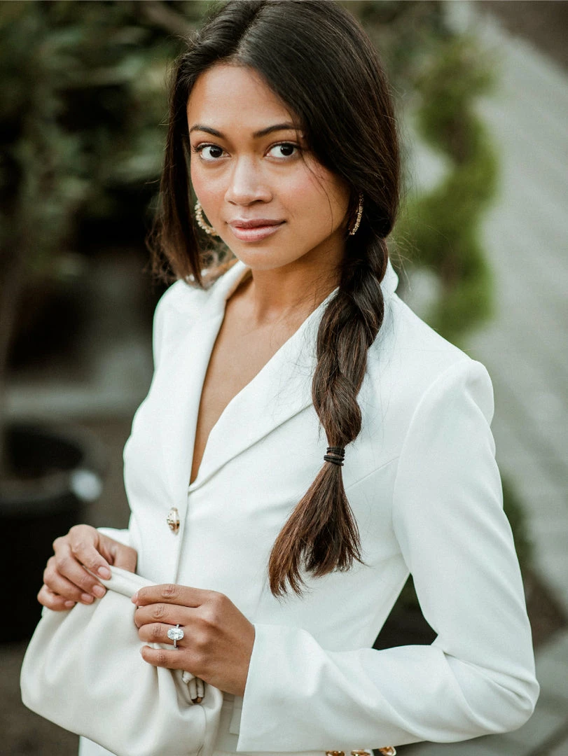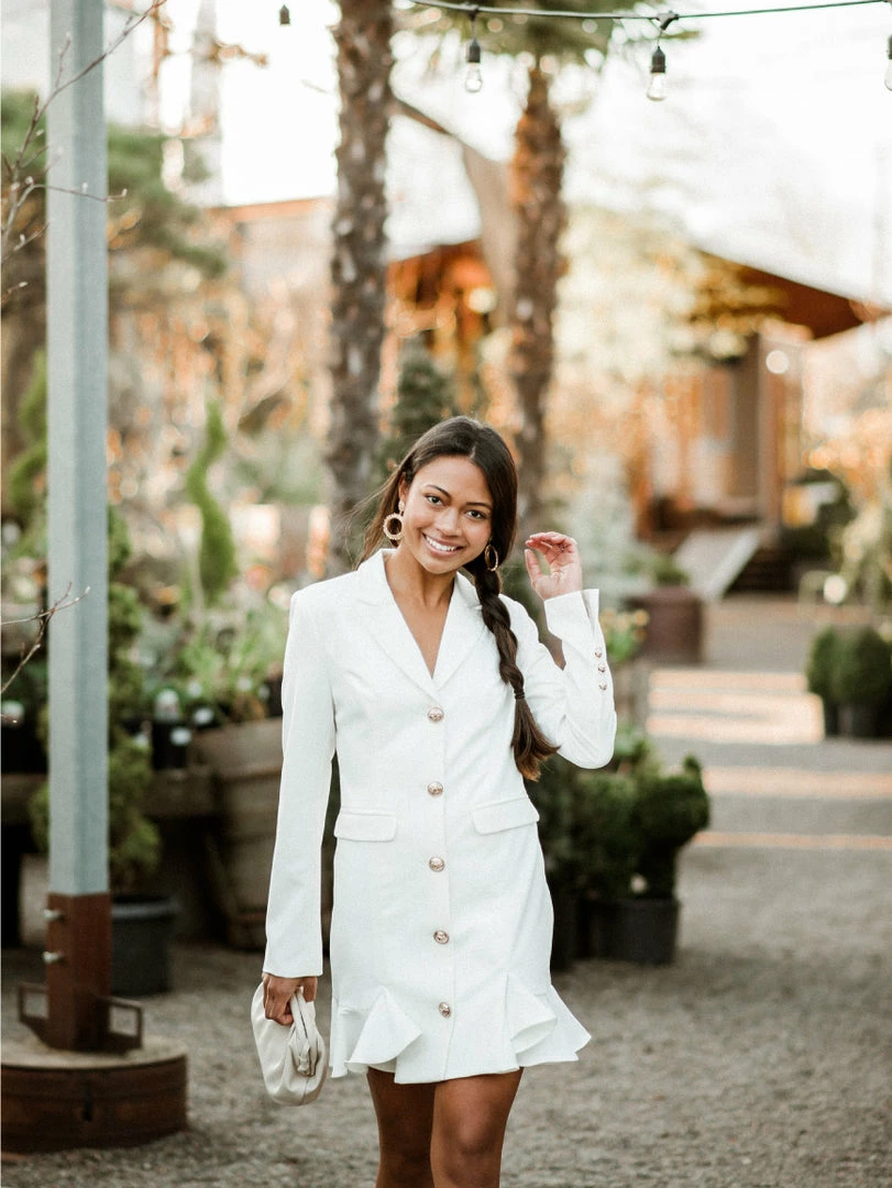 The Milly Blazer dress is here for all our sleek and sexy brides. Features structured blazer top with ruffle bottom mini. Gold buttons. Fully lined.