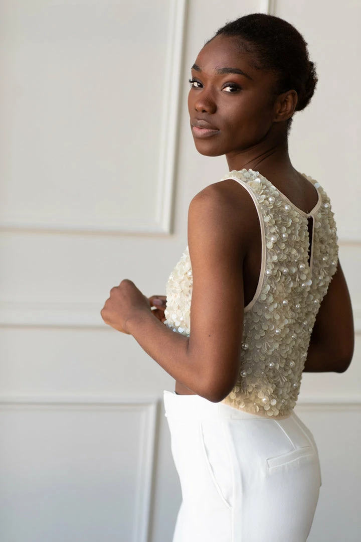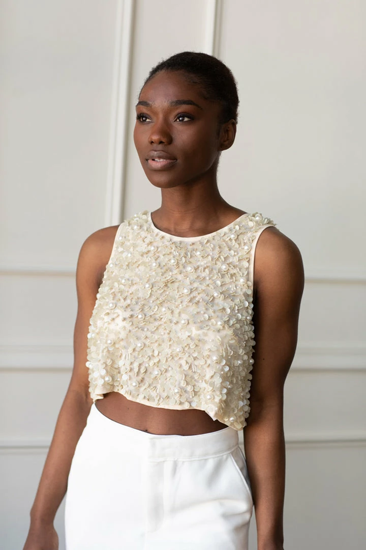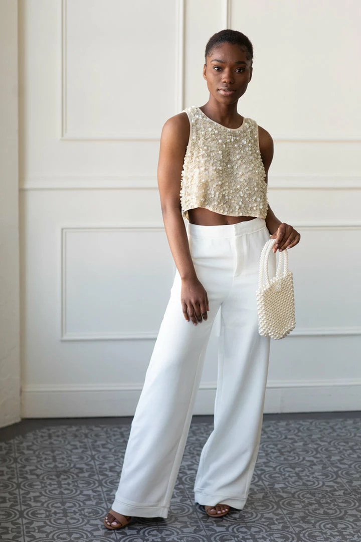 For that special event you want to dazzle at. This beaded crop top features delicate ivory beading and sequins. Perfect when paired with our White Wide Legged Pants or any high waisted pant or skirt.