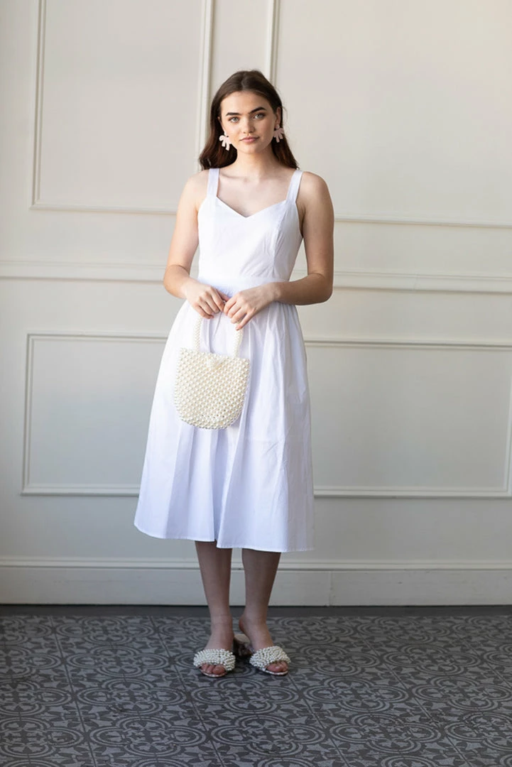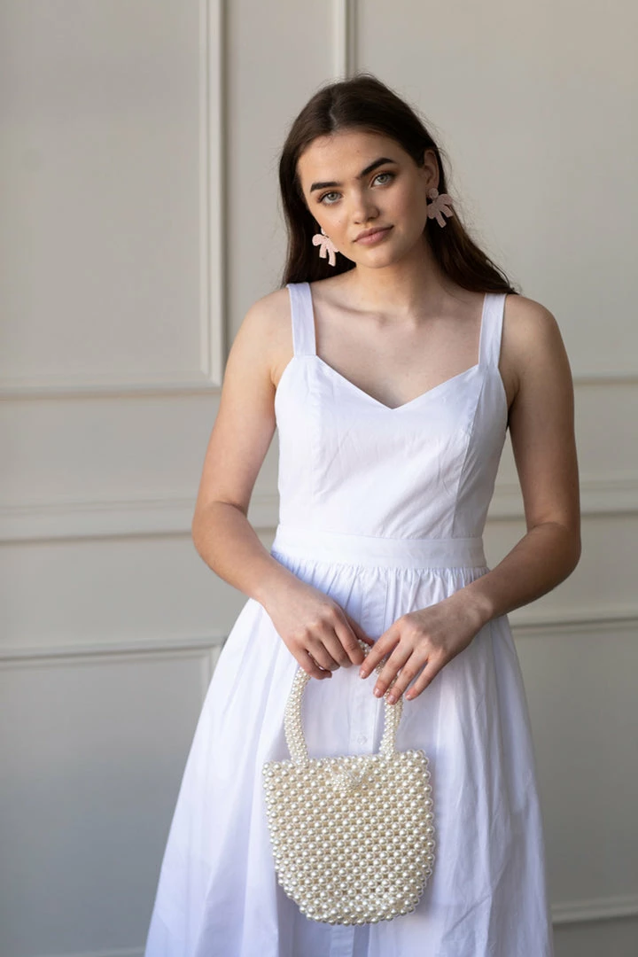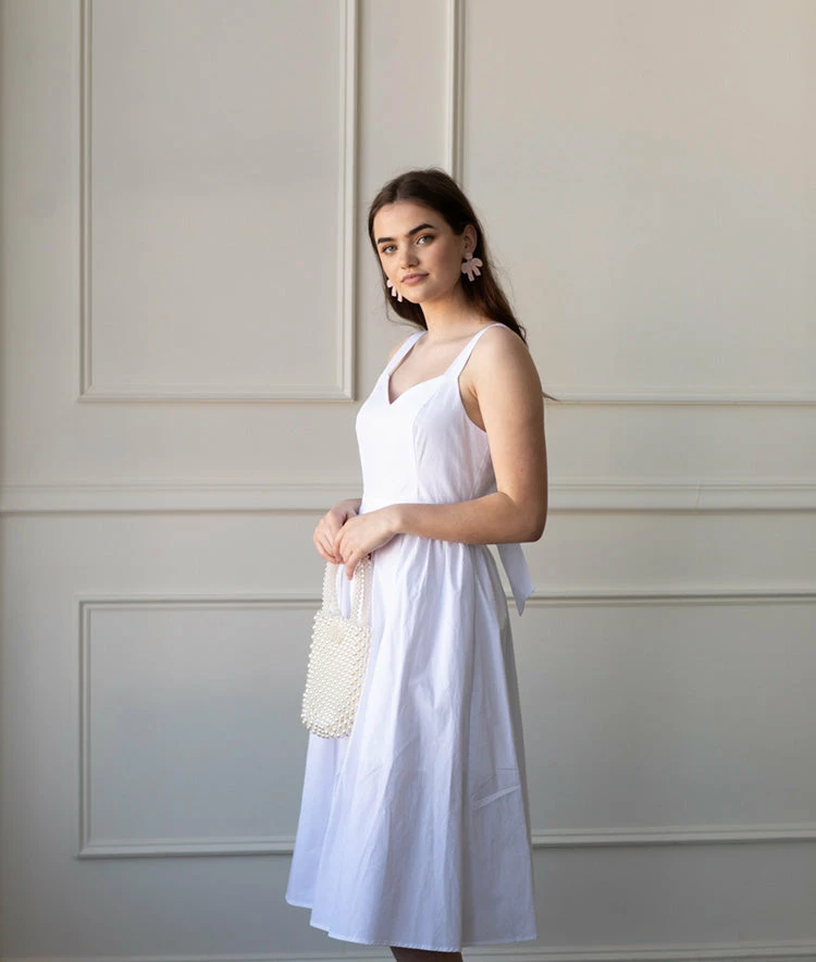 Look picture perfect in our Nantucket Midi Dress. This simple yet classic style features a swishy cotton midi skirt and bow tie back. Perfect for classic brides’ welcome parties and brunches and a summer dress that will always be in style. Love this with our Eos Pearl Bag.