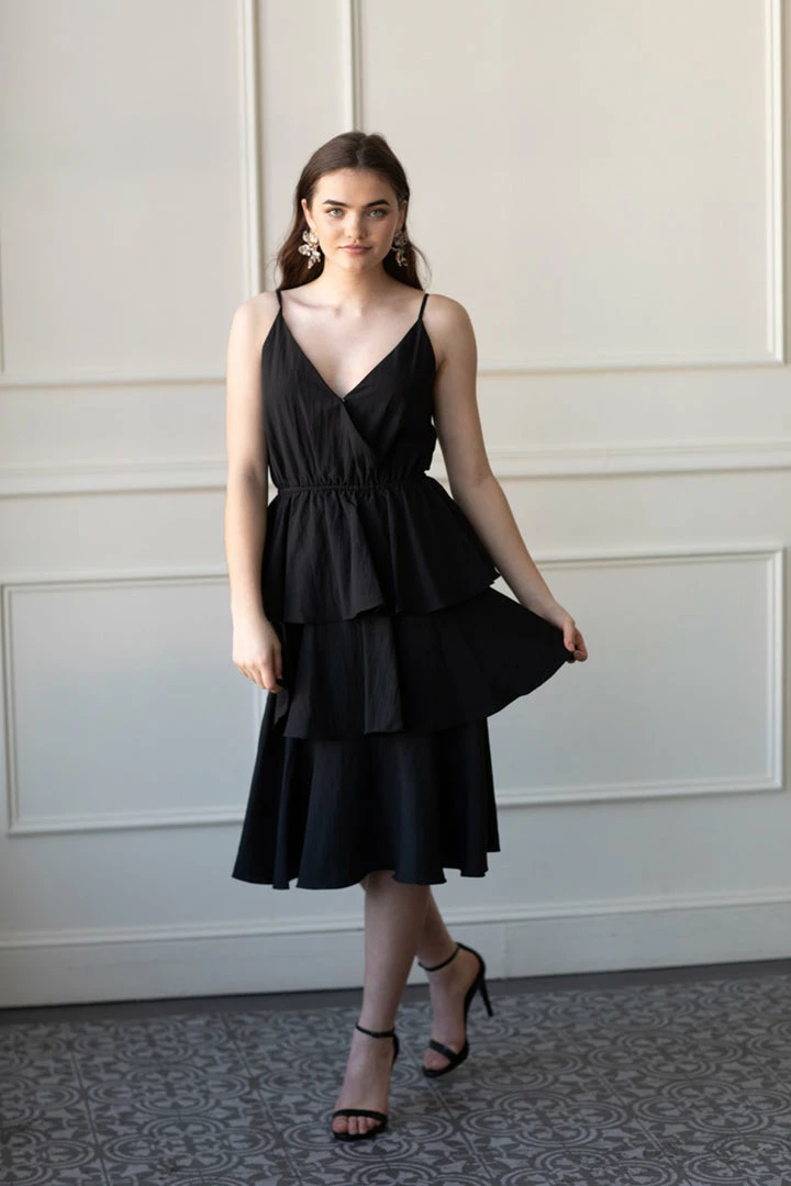 Say hello to your new favorite little black dress. Our clean and classic Martha ruffle midi dress is perfect for a fall wedding guest dress. Adjustable spaghetti straps. Stretchy waist. Swishy tiered midi skirt. Available in white, black and red stripe.