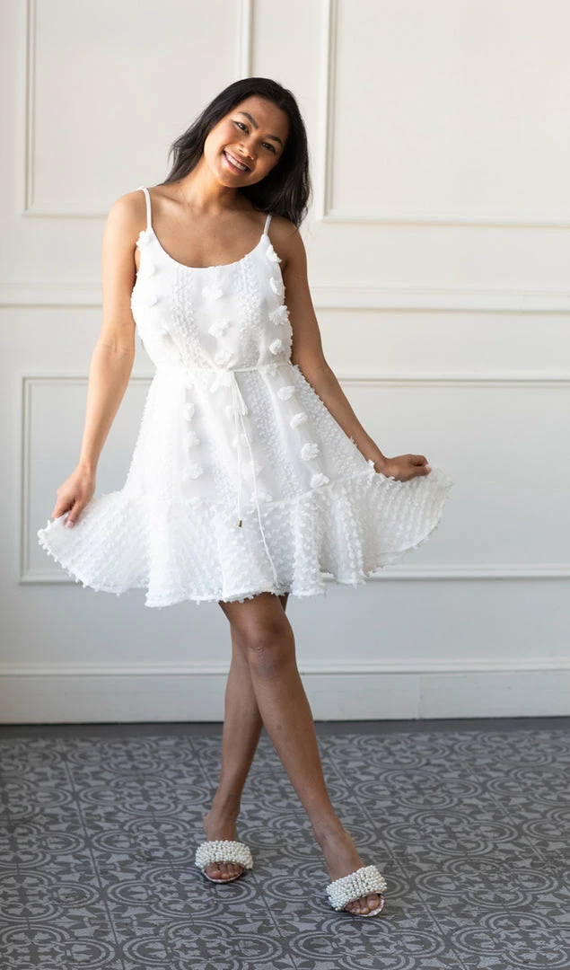 Our Molly Pom Pom dress is perfect for all you party girls out there. Versatile enough to wear with heels for a night out or with a jean jacket and sneakers for a brunch with friends.  This style is an ideal white bachelorette party dress. Â