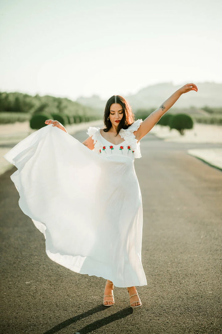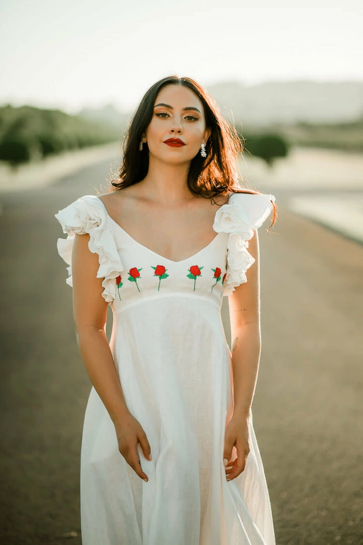 This is our pick for the 2022 bride. The statement-making Demre White Maxi Dress works for everything from rehearsal dinners to elopements to honeymoons with its bold ruffle cap sleeves, rich rose embroidery and comfortable bodice. Accented with a low back. 100% linen. This style is also bump-friendly. From black-owned brand, Fanm Mon, the Demre dress also comes in a variety of colors that can be special ordered. The Demre in Blue is currently available on ConfĂȘte.