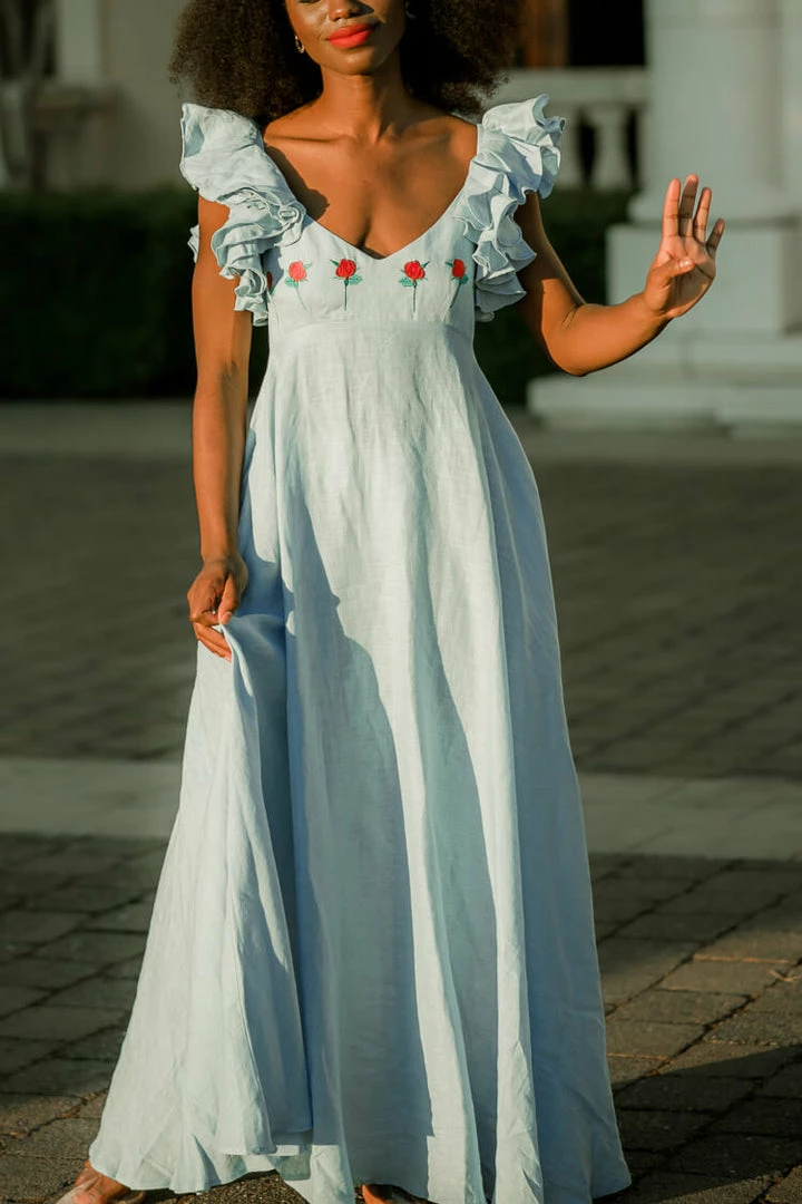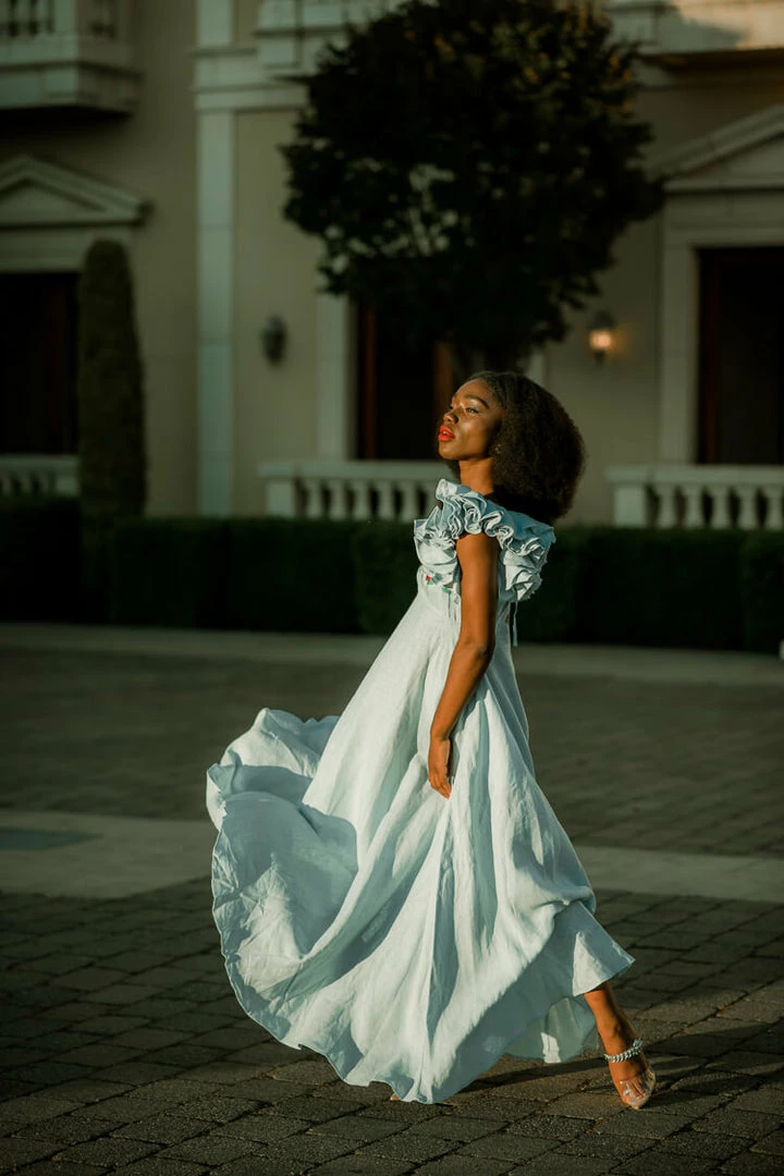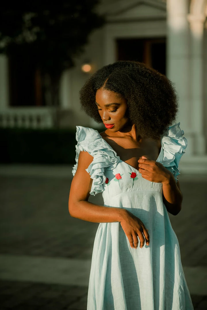 The statement-making Demre Blue Maxi Dress is our top pick for special occasions this season. This 100% linen maxi works works for everything from rehearsal dinners to baby showers with its bold ruffle cap sleeves, rich rose embroidery and comfortable bodice. Accented with a low back. From black-owned brand, Fanm Mon, the Demre dress also comes in a variety of colors that can be special ordered. The Demre in White is currently available on Confête.