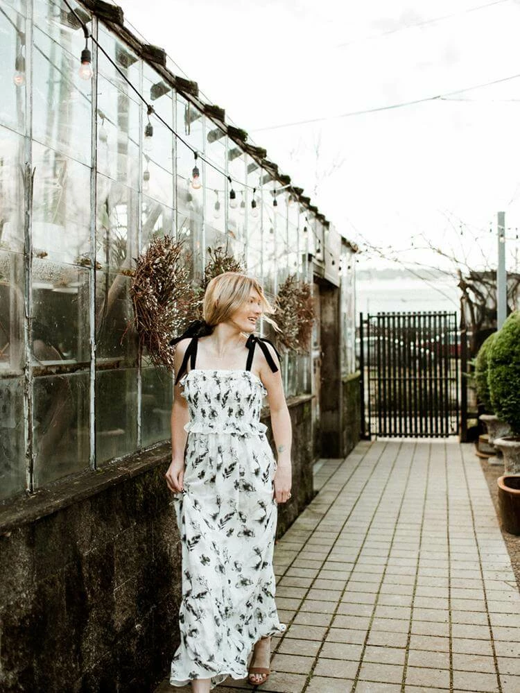 Imagining we’re at a fancy dinner party at an English manor in our Arabella Ribbon-Tie Maxi. Ribbon-tie shoulders. Cream and black floral print. Ruched top. Ruffle bottom. Maxi dress.