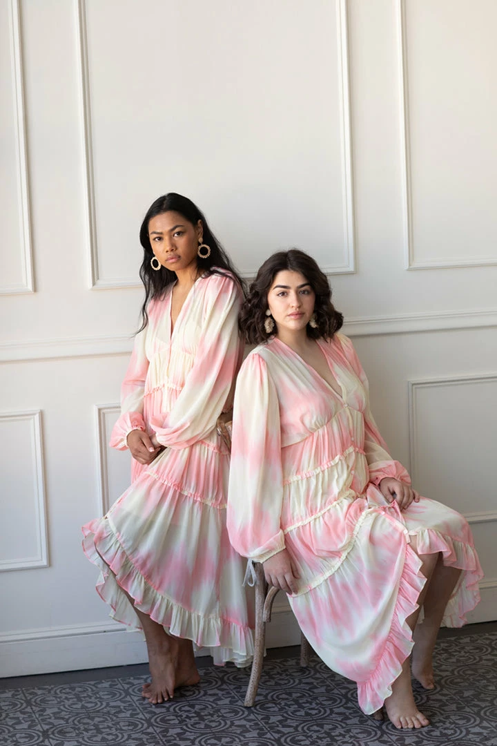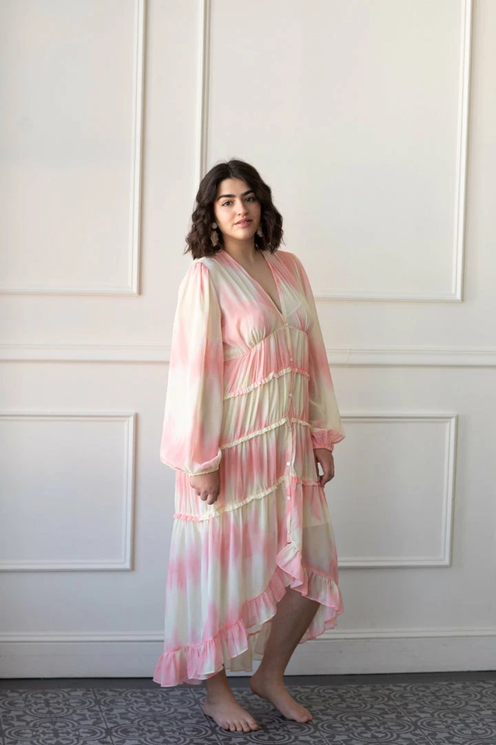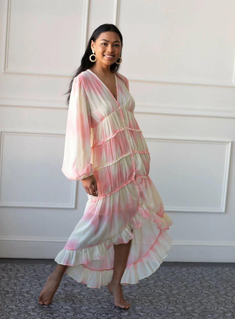Designed with an all-over watercolor print, our Tie-Dye Sunset dress is perfect for all those summer nights. Featuring blouson sleeves, button-down front and tiered maxi skirt. Pictured in XS and L.