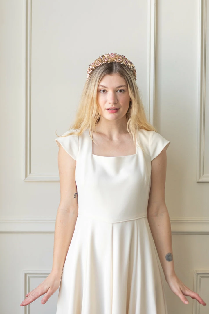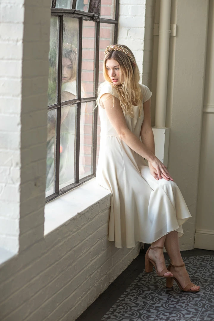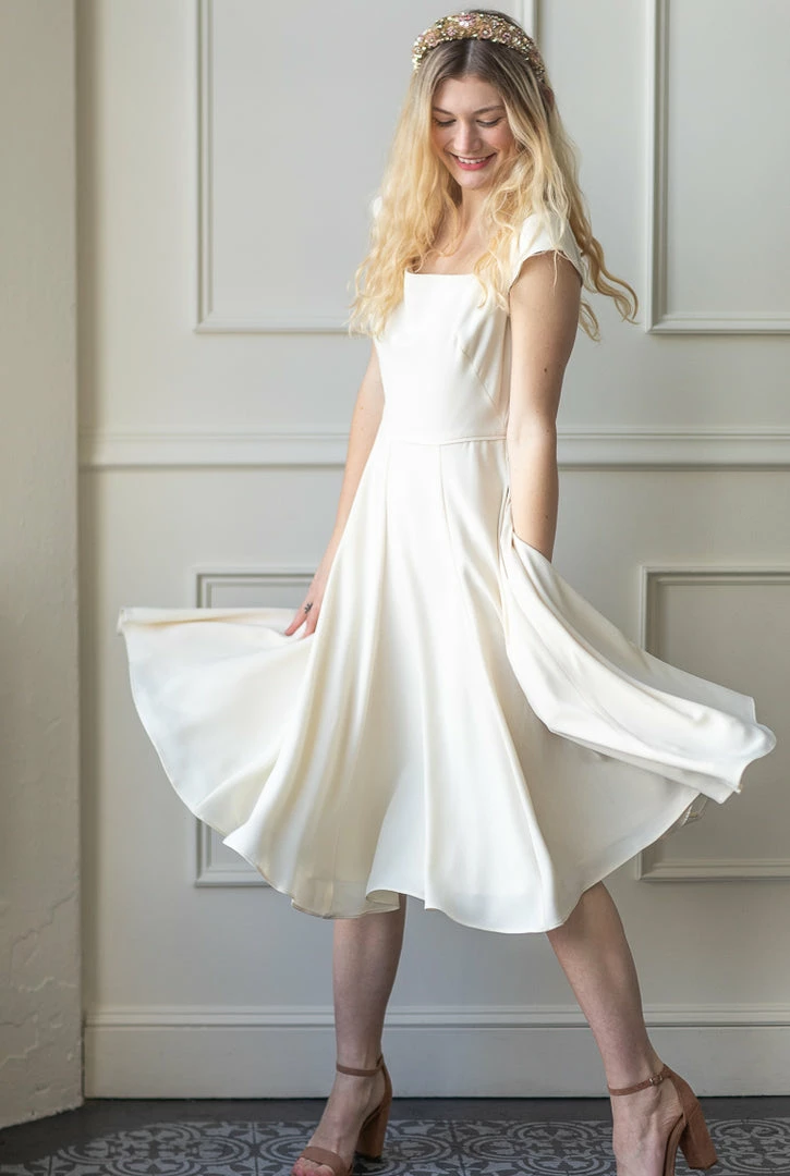Stand out in a crowd in the effortlessly chic Regina midi dress. This is a great option for a classic bride for any wedding event from Gal Meets Glam. Features a square neckline, a-line skirt, cap sleeves and pockets. The flattering fit and flare makes it a favorite amongst our plus size brides. Also available in red. Pictured in size 14 and 2.