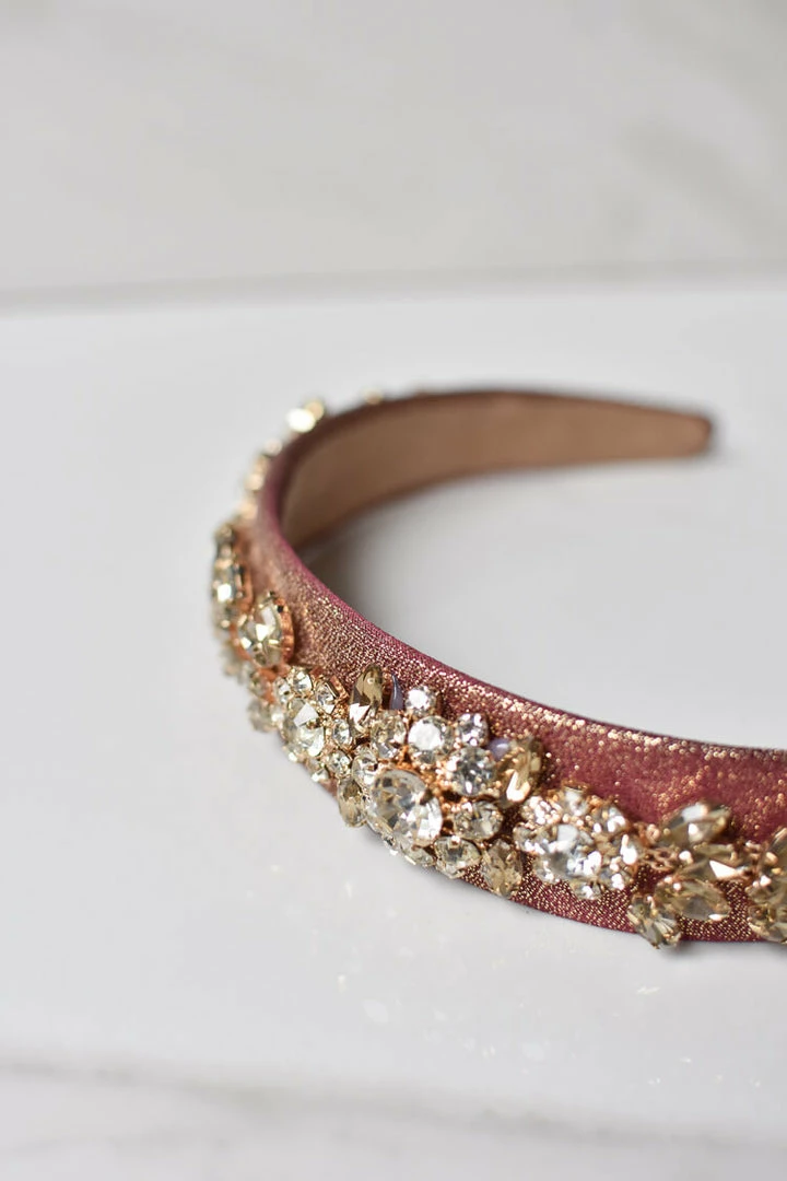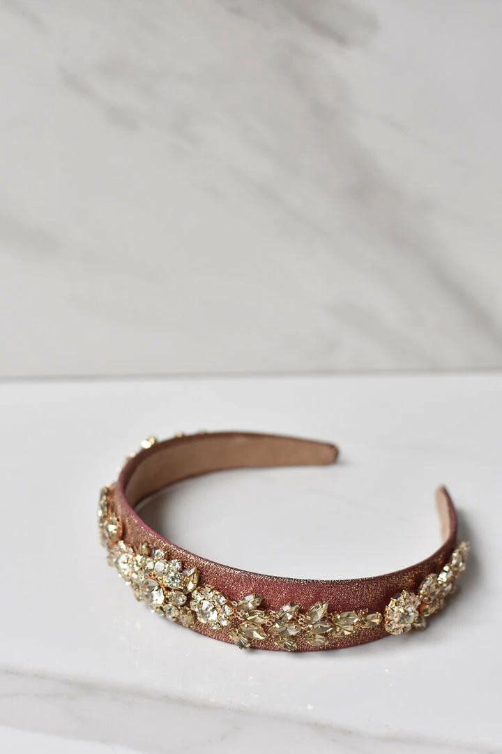 The Jacklyn headband brings the glitz to any hair style. This headband features multi-shaped crystal clusters atop a headband wrapped in shimmering burgundy gold fabric. Wear as a statement-making accessory to holiday dinners with friends.