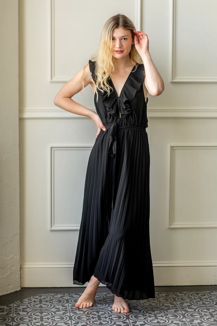 Up your wedding guest dress game with this little black dress! The floaty skirt of our Ravello Deep V Pleated Black Maxi dress will instantly transport you to the Amalfi Coast.  Featuring a ruffle lined v neckline and pleated chiffon skirt.  Pair with our Brodie barrette.  Fully Lined.  Hidden back zipper.  Available in black and white. Â