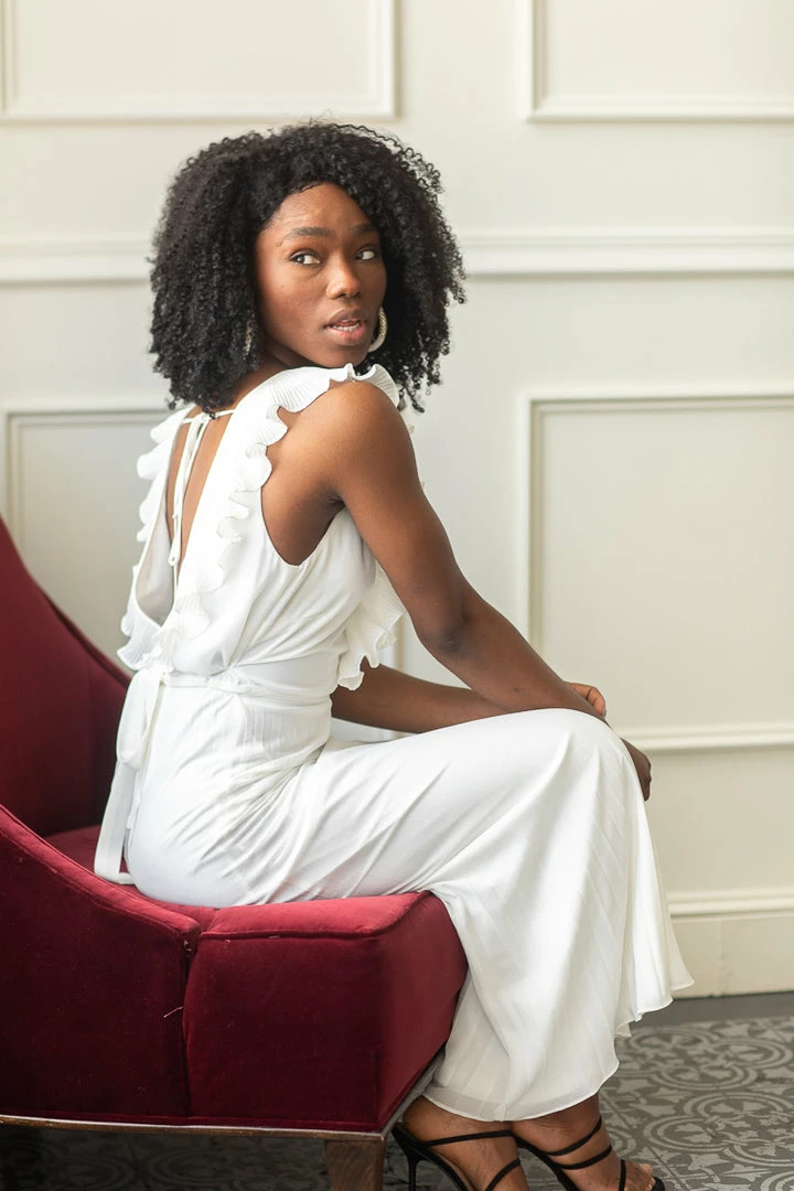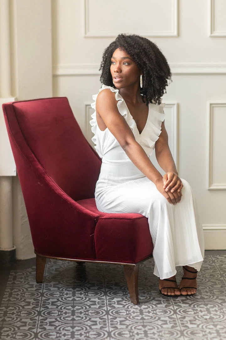 The floaty skirt of our Ravello Deep V Pleated white maxi dress will instantly transport you to the Amalfi Coast. Featuring a ruffle lined v neckline and pleated chiffon skirt. Fully Lined. Hidden back zipper. Available in black and white.