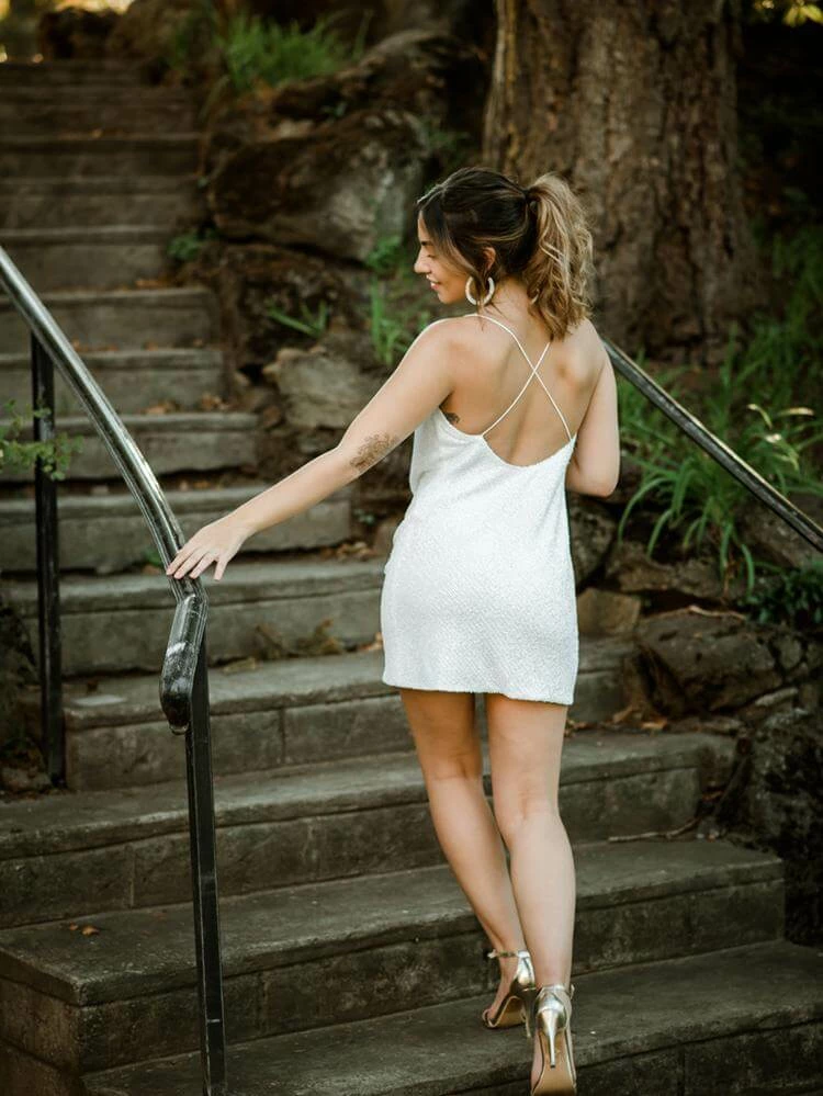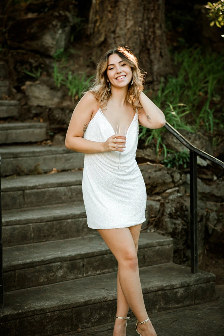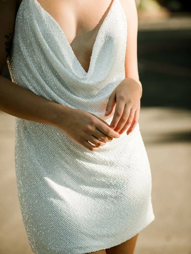 The Baldwin Sequin Mini Dress in White is party girl perfection. We love this cowl-neck mini dress for bachelorette parties or wedding after parties. Cut in a body-hugging shift silhouette. Cross-back straps. Pull-on styling. Fully lined.