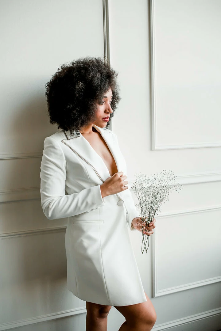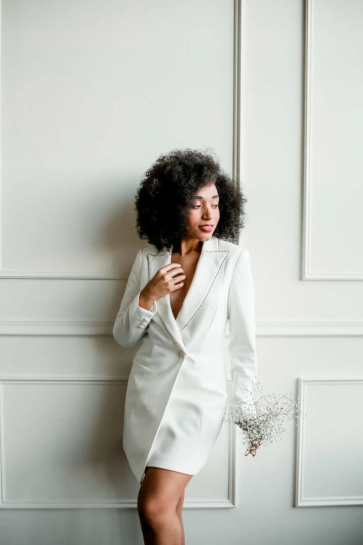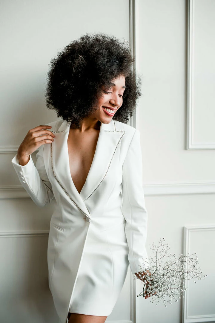 A subtle update on our most-loved Ace White Blazer Dress, now with rhinestone trim detailing along the lapel. Cut from stretch crepe, the Ace is a mini dress with clean sleek lines, padded shoulders and deep V neckline. Covered button details. Really looking to make a statement with your bridal attire? Try with white sneakers for an ultra-cool city hall wedding look.