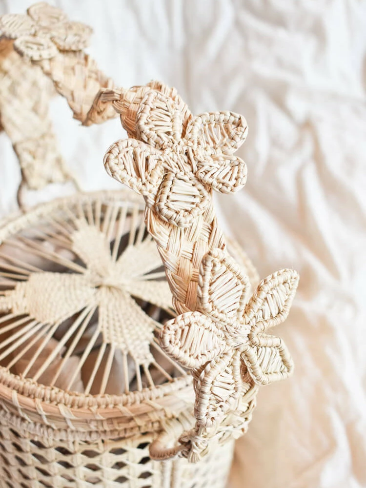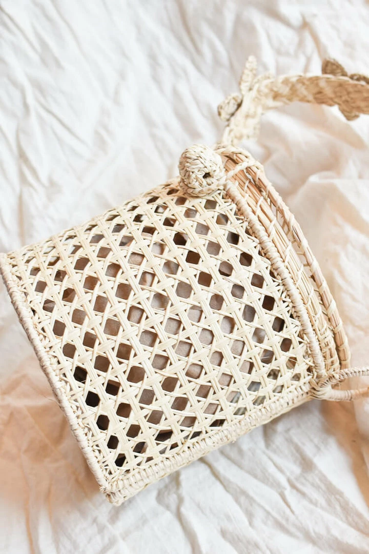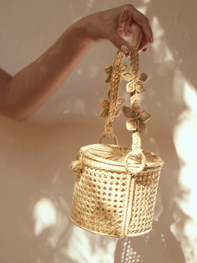 We adore KAANAS’ attention to detail and dedication to artisanship, and it shows in the Florencia Handwoven Straw Bucket Bag. This sweet style is crafted from unlined wicker and features floral details along the handles. Box top closure with loop fastening.