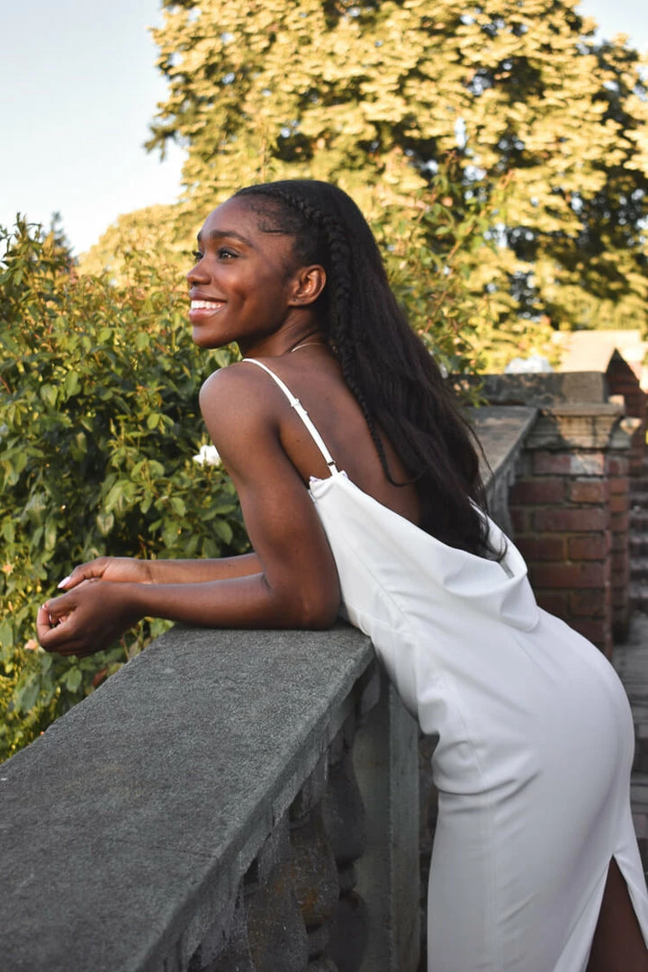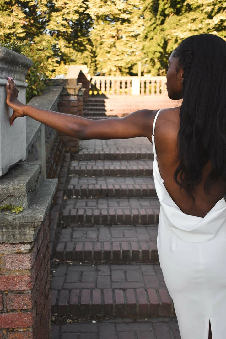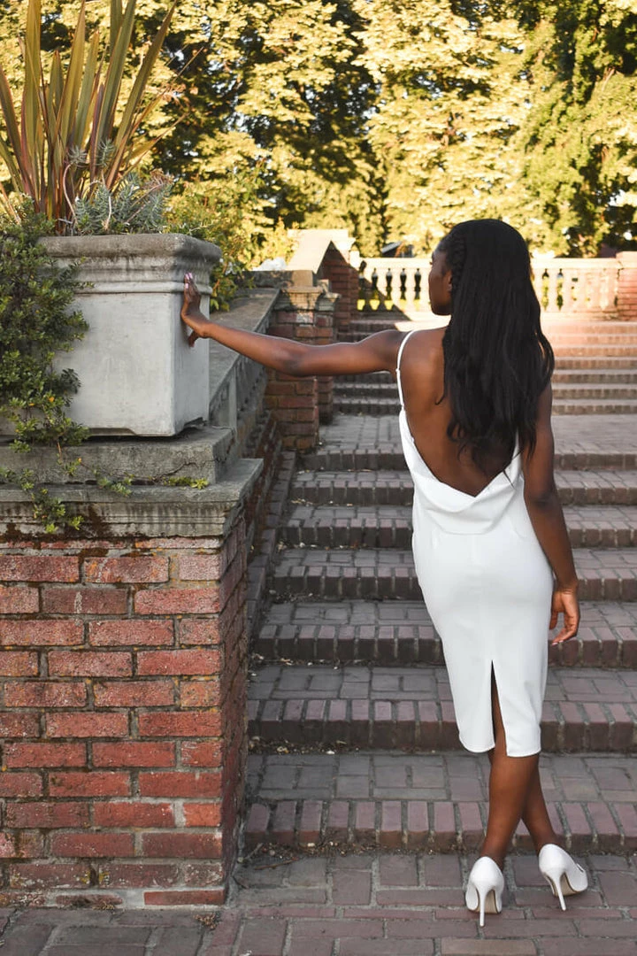Looking for a classic bridal style with a twist? Try the Pretty Bird Midi dress from Katie May, which is a little white cocktail dress that features a dramatic low cut cowl back. Hidden side zip. Adjustable spaghetti straps. Lined. Proudly made in the USA.