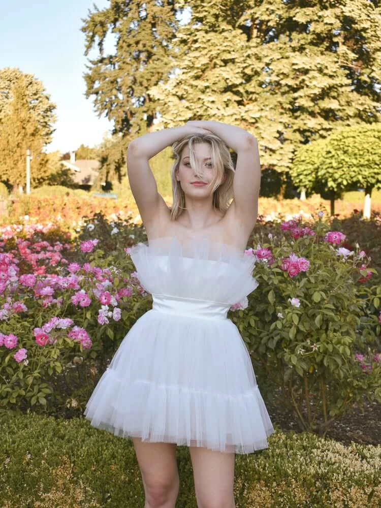 The ultimate party girl dress! Meet Elle from Katie May – a delightful tulle mini dress, made for wedding after-parties and bachelorette trips alike. Features a contrasting waistband over multiple layers of tulle. Strapless style. We love the versatility of this dress; you can make it edgy, girly or sexy! Hidden back zipper. Proudly made in the USA.